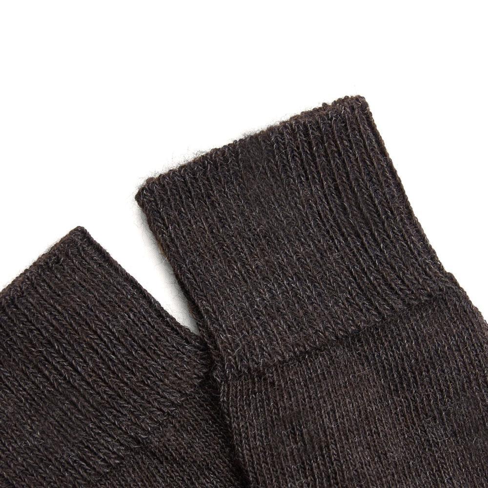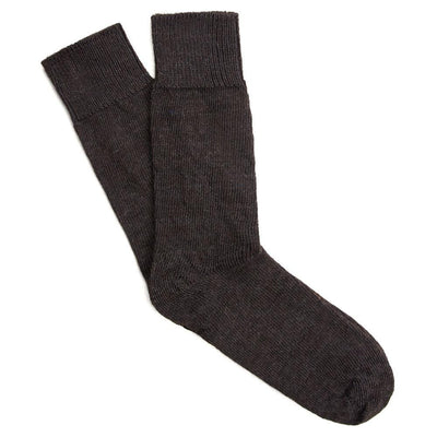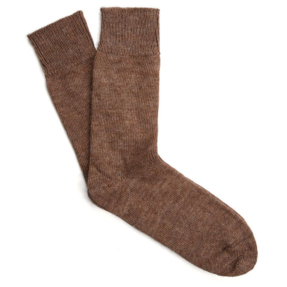 Person wearing a brown alpaca socks and shoe and dark sock on a neutral background