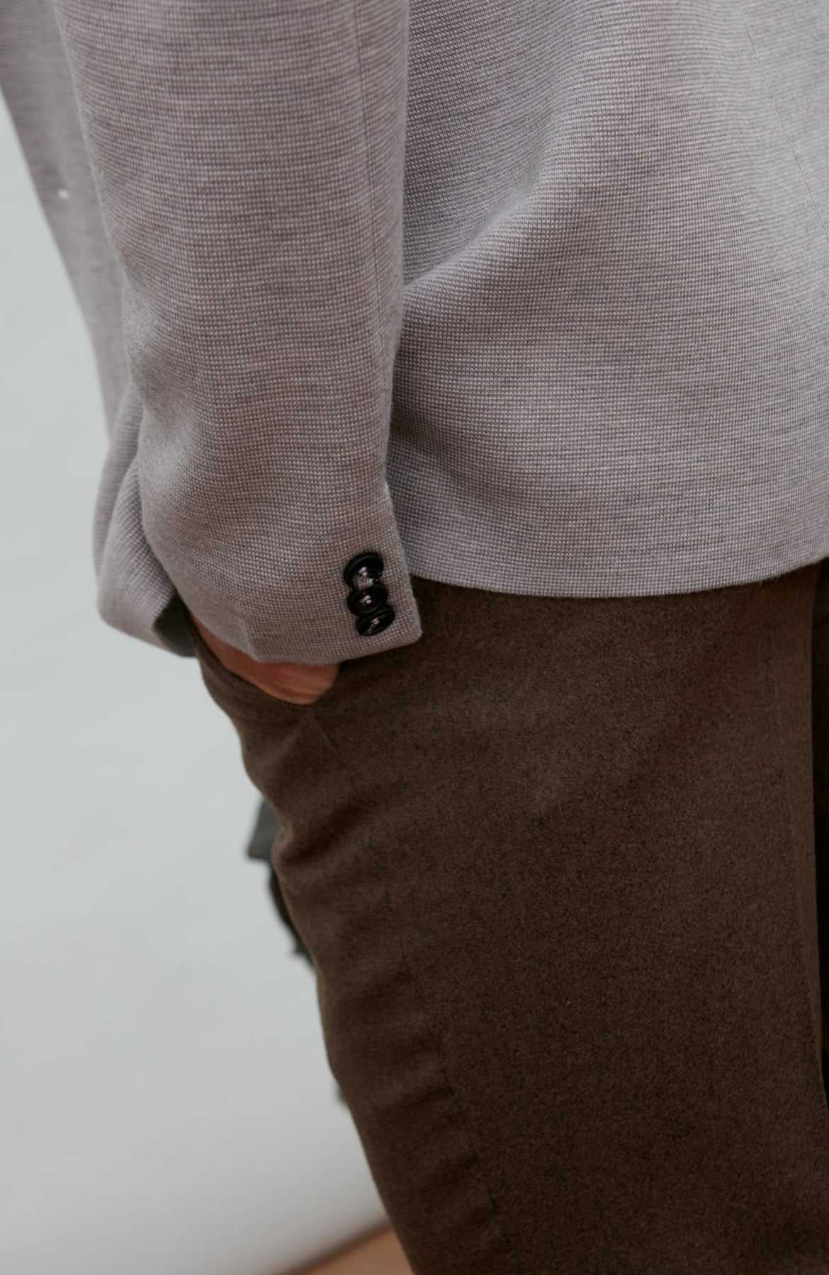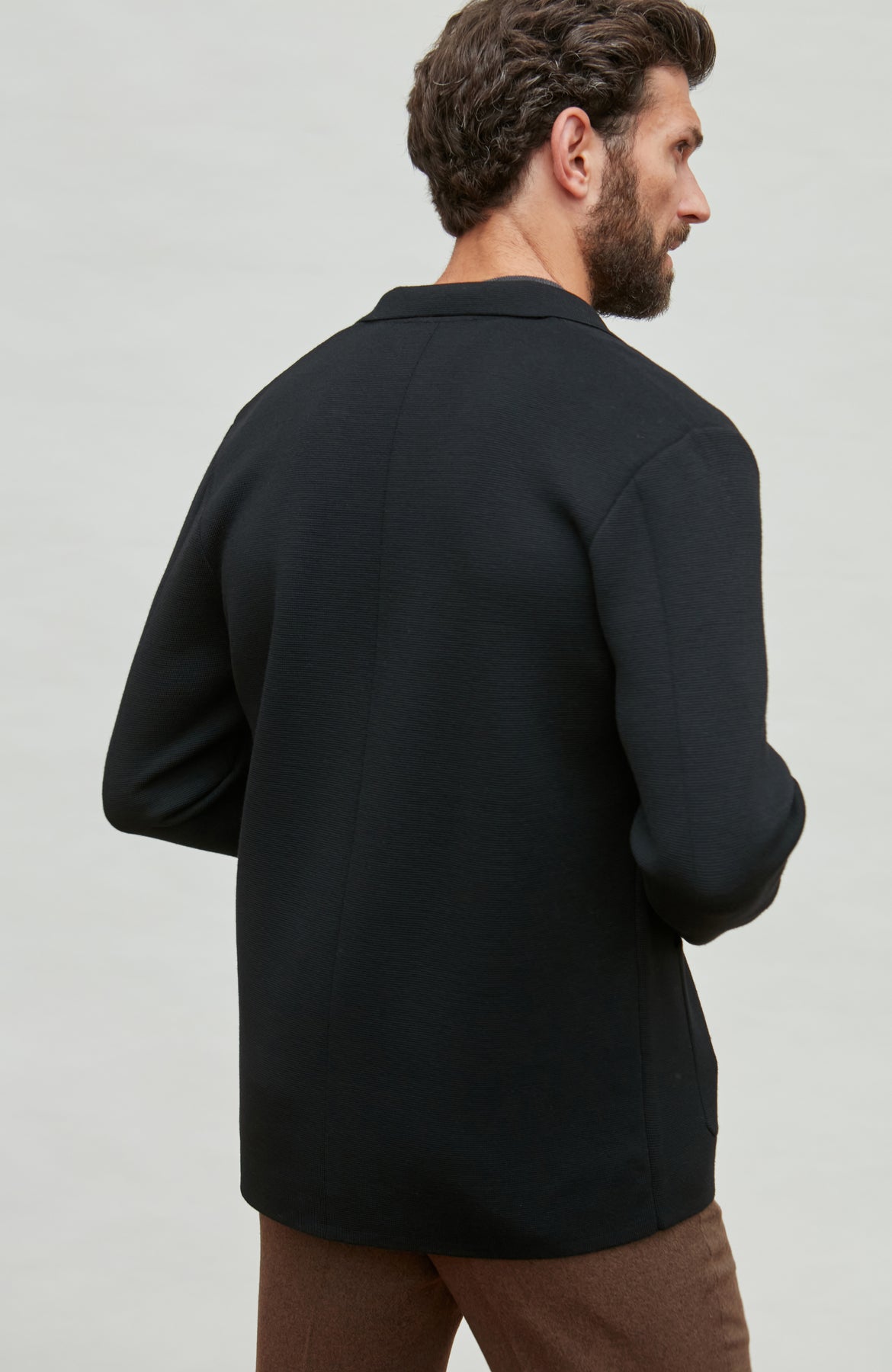 Knitted in a full Milano knit, the fabric offers structure and a luxurious drape, enhanced by thoughtfully added three-buttoned cuff details. Featuring two front patch pockets and a buttoned inside pocket, this blazer is practical for everyday use.