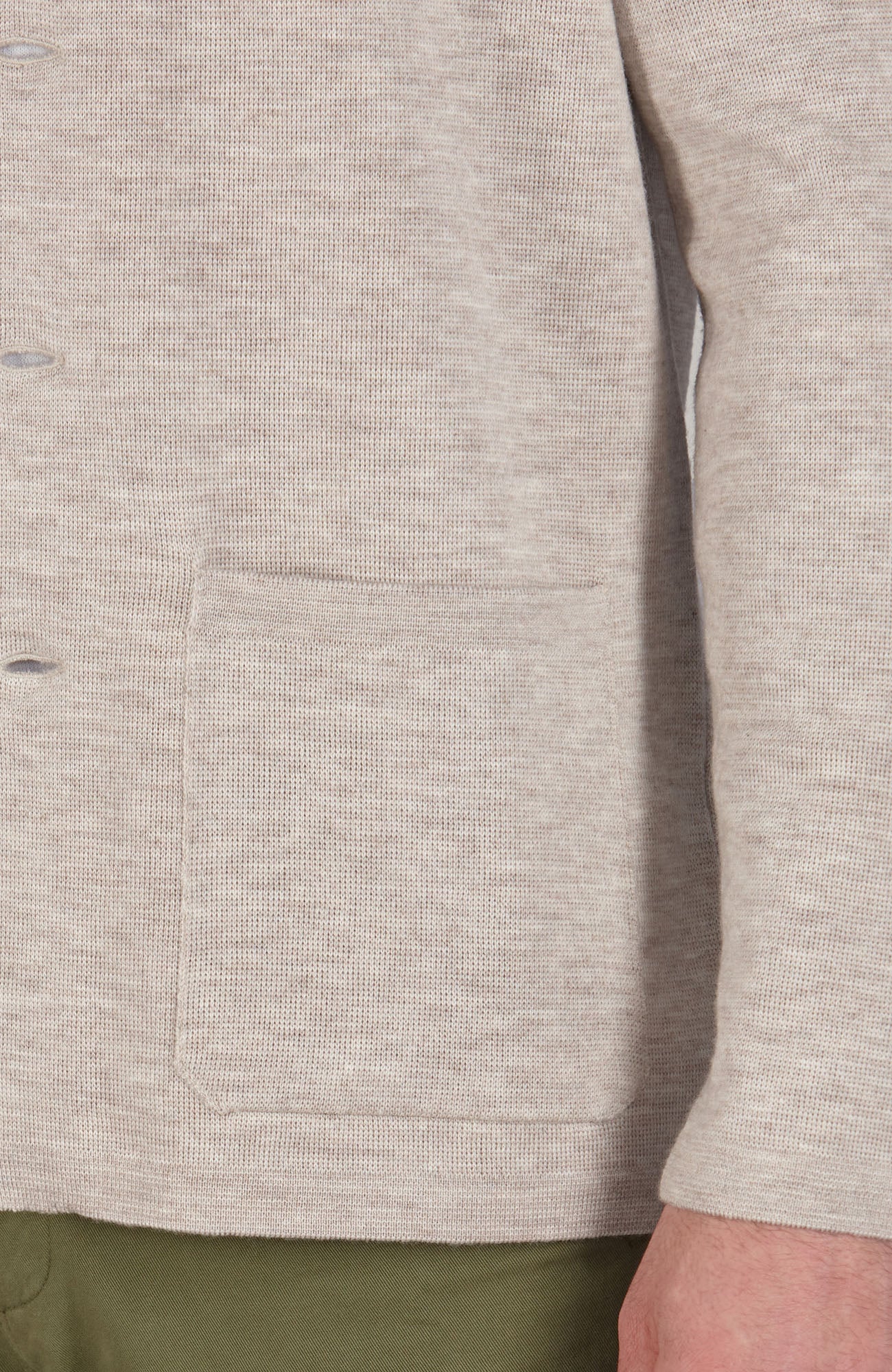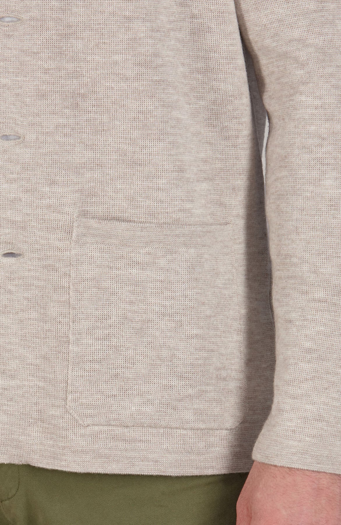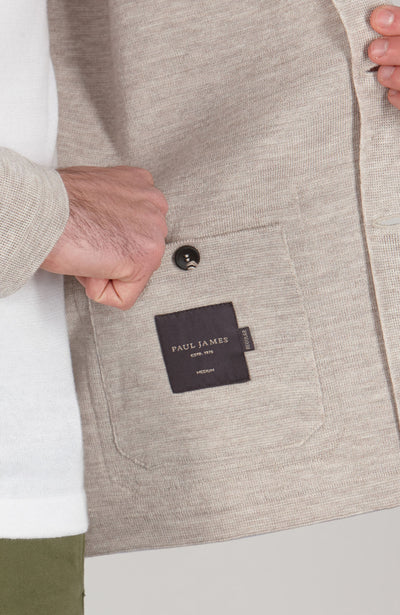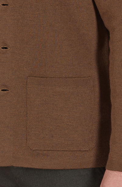 Details include a mock chest welt pocket, two patch pockets, an internal buttoned pocket, natural Italian-made buttons, a hook collar closure, and full Milano knit trims for durability and shape retention.