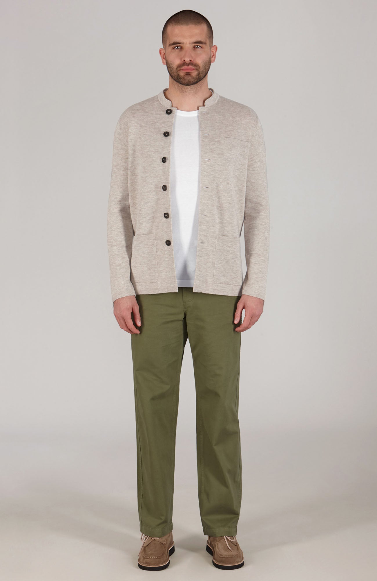 Man wearing a black mandarin collar jacket in fine wool over a white shirt and green pants against a light gray background