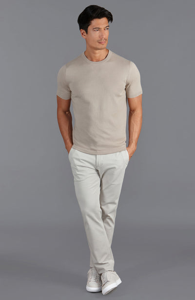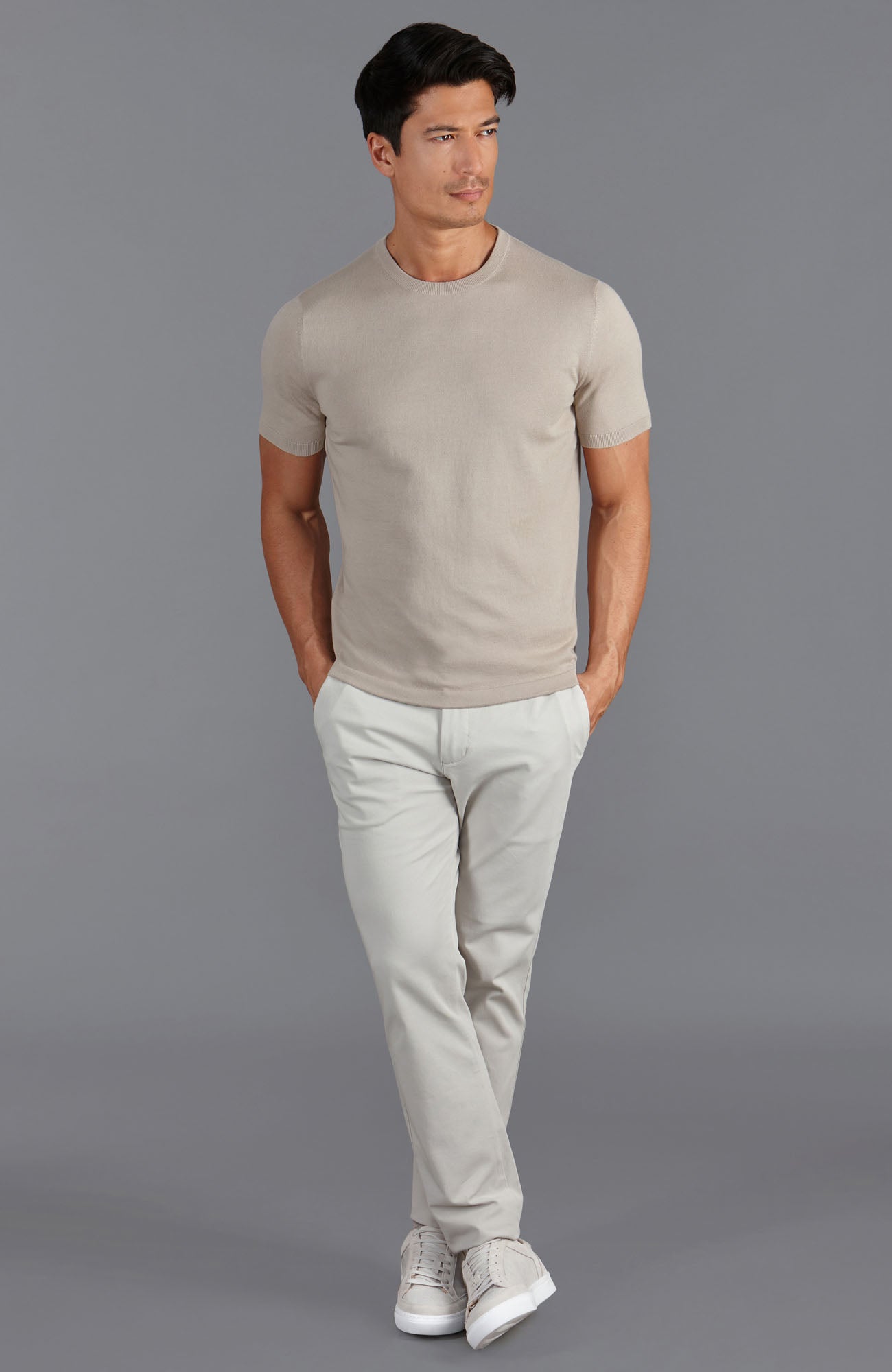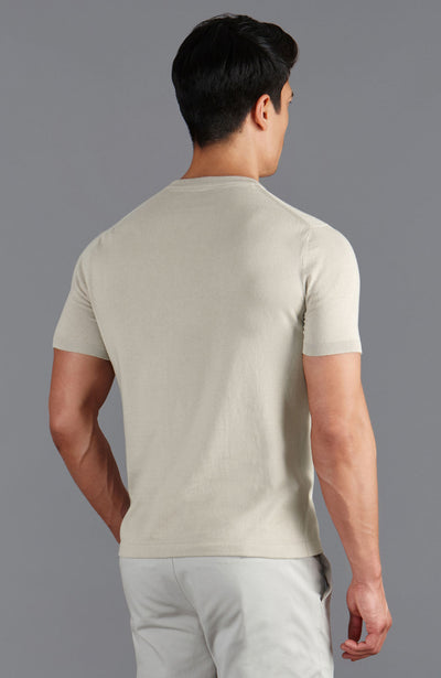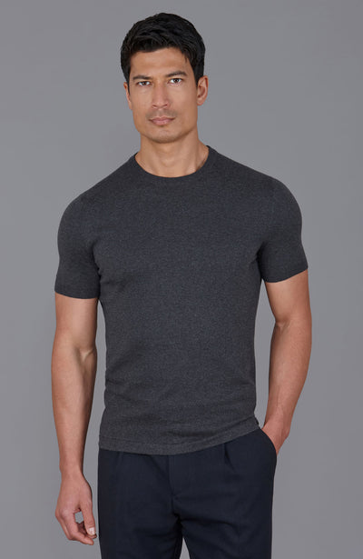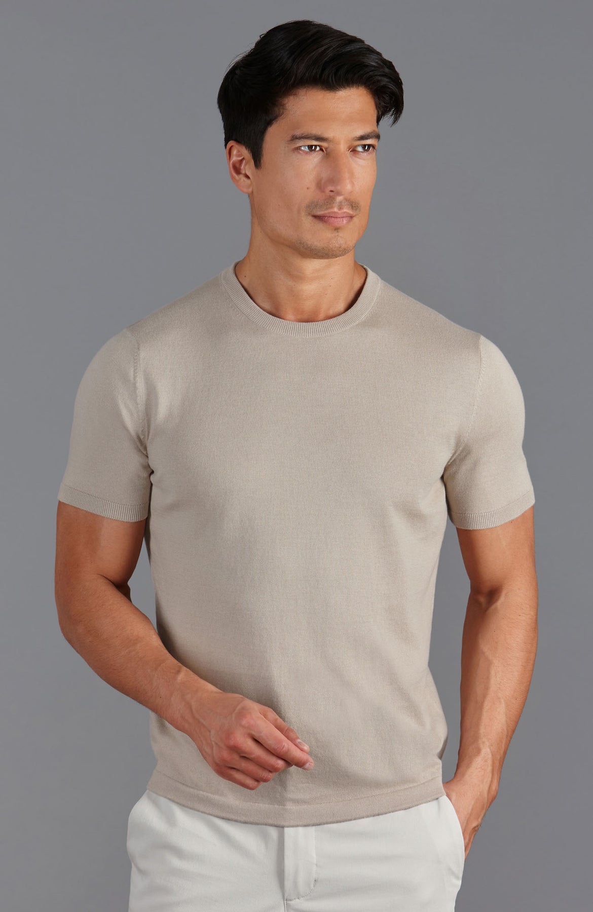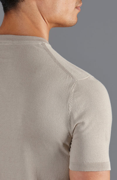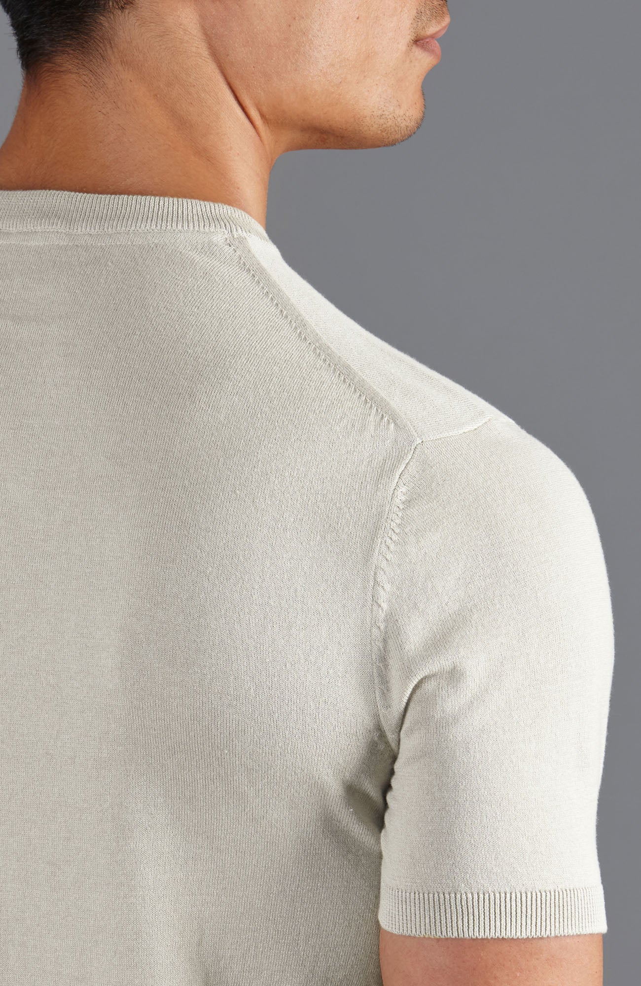 Hugo ist eine gehobene Version eines Klassikers in der Garderobe und ein Rundhals-T-Shirt aus ultrafeiner Baumwolle mit klassischer, schlichter Strickstruktur. Mit französischen Schulterdetails und einem Schnitt um den Hals haben wir dieses stilvolle T-Shirt so entworfen, dass es elegant genug aussieht, um es unter einem Blazer zu tragen, oder darüber getragen genauso gut auszusehen