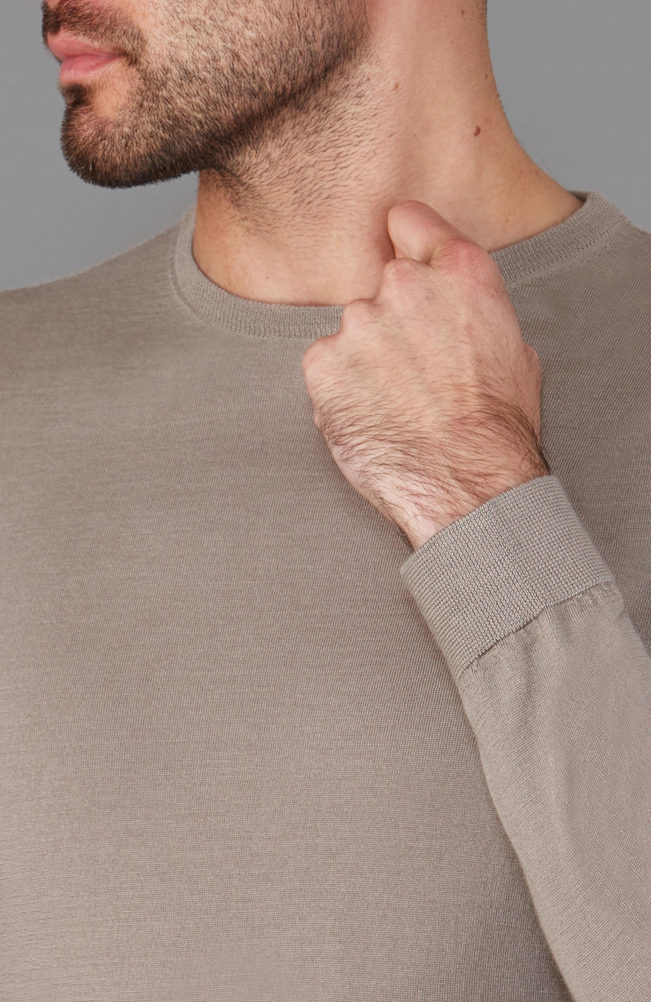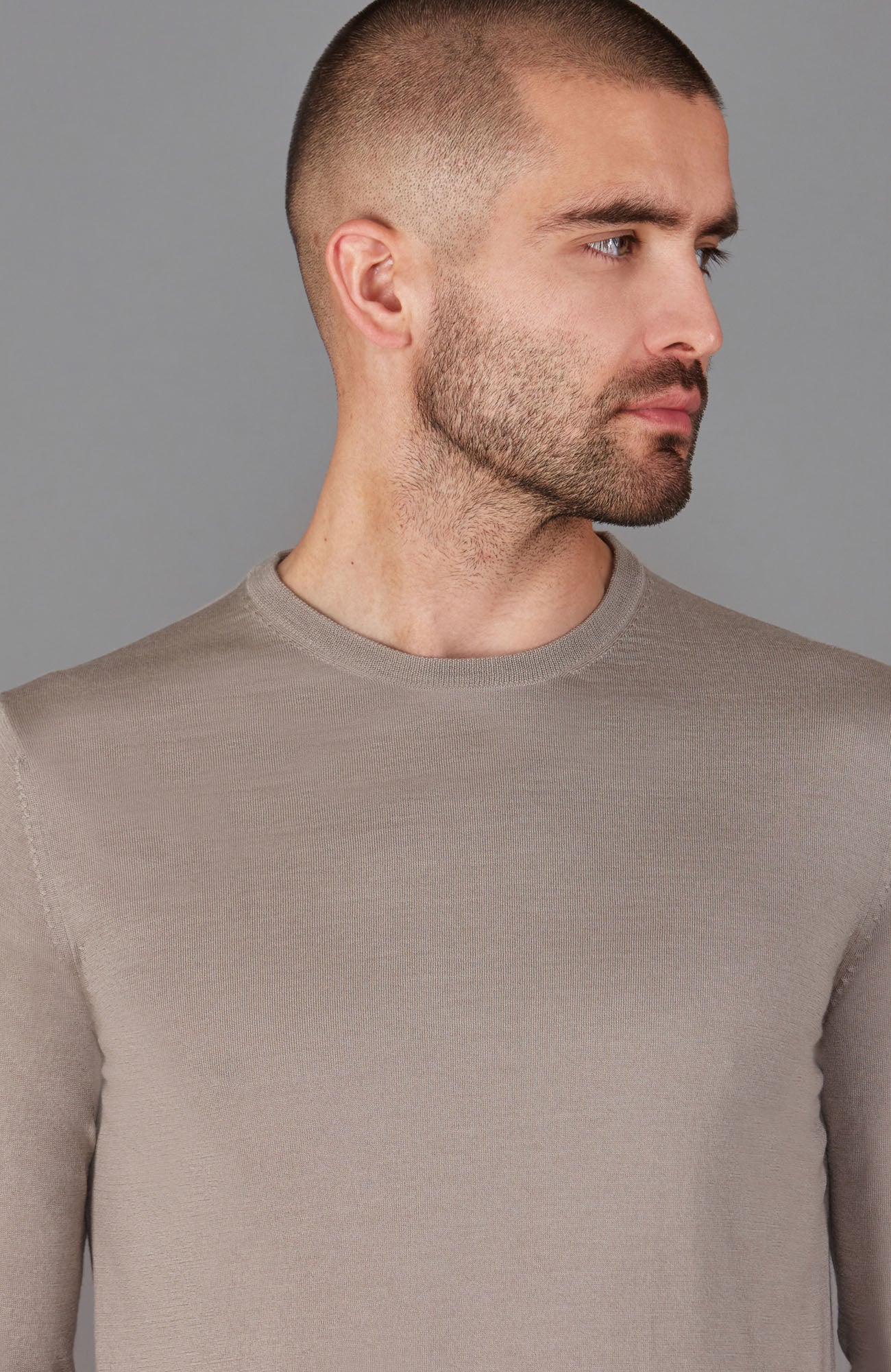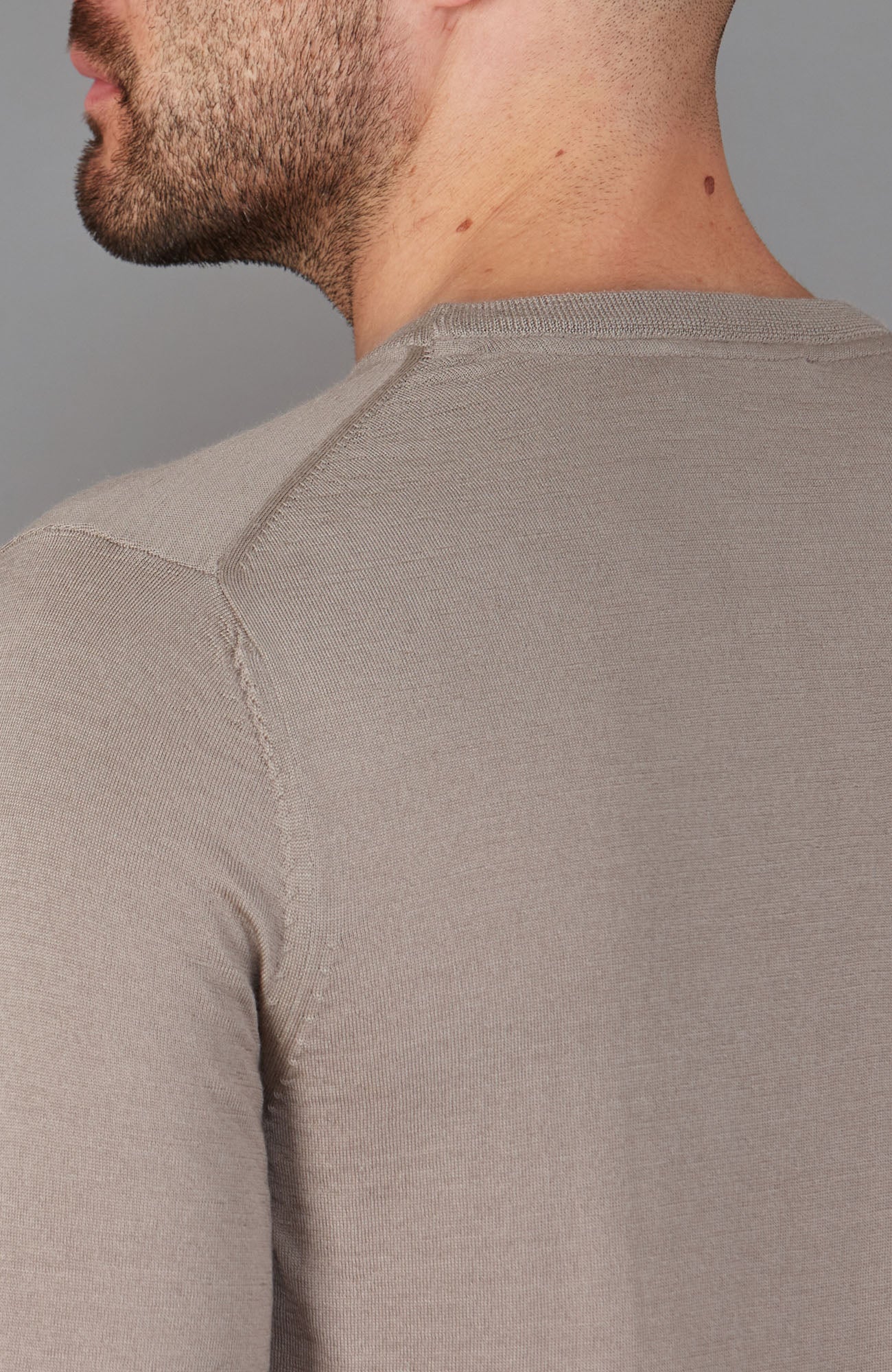 Taupe - Chan is 6ft (182cm), chest size 40" (101cm) and wears medium for a fitted look
