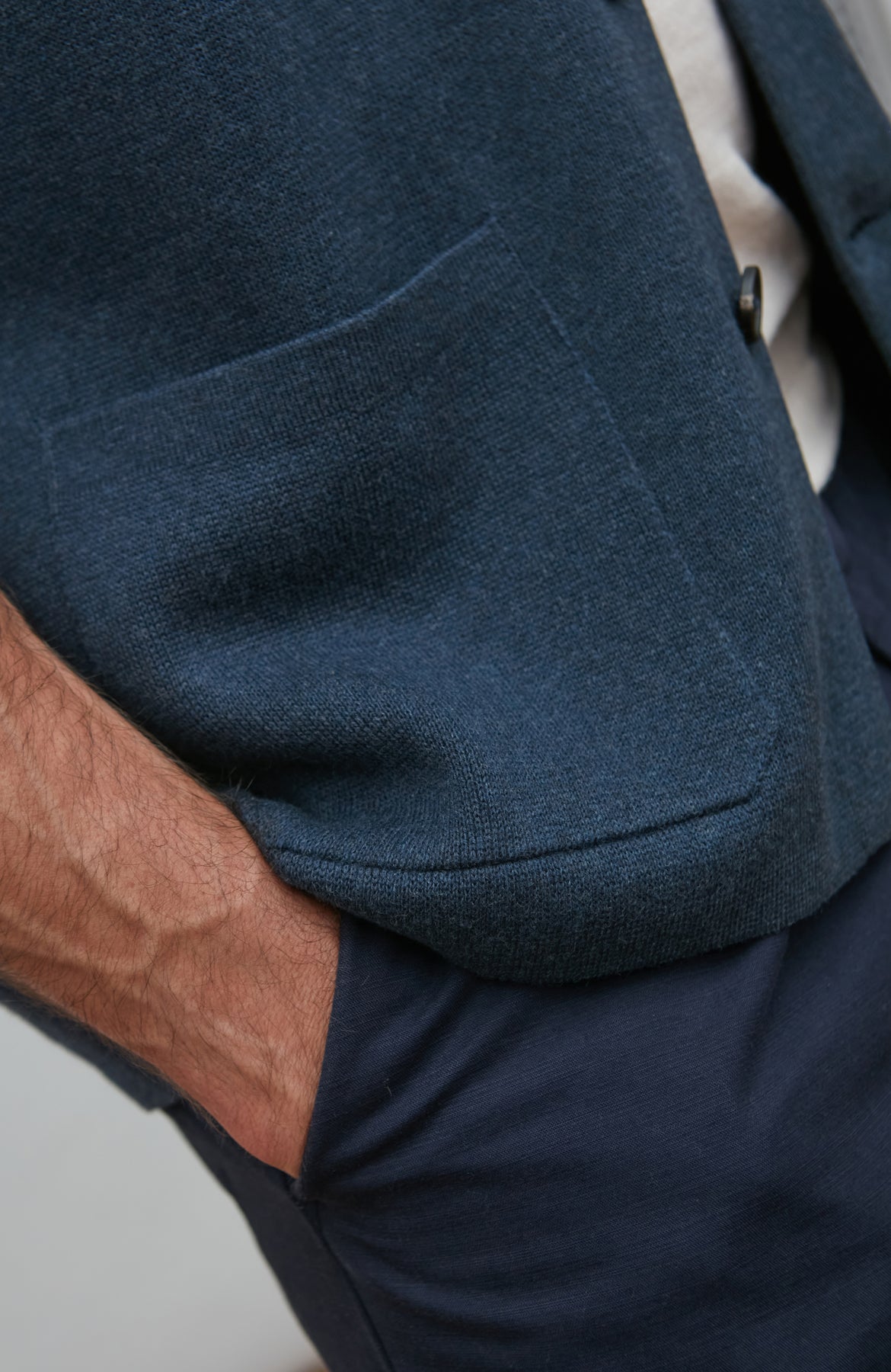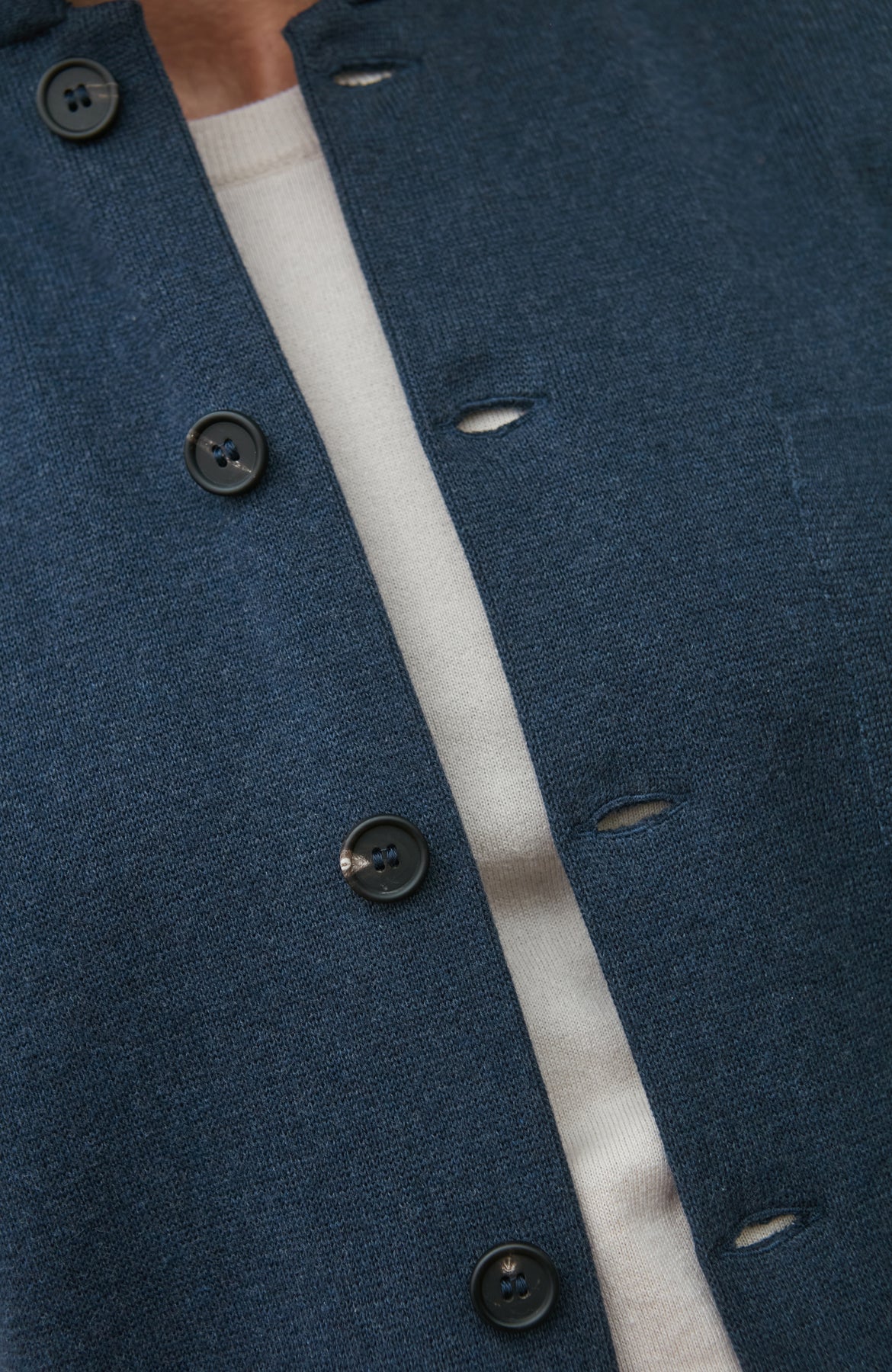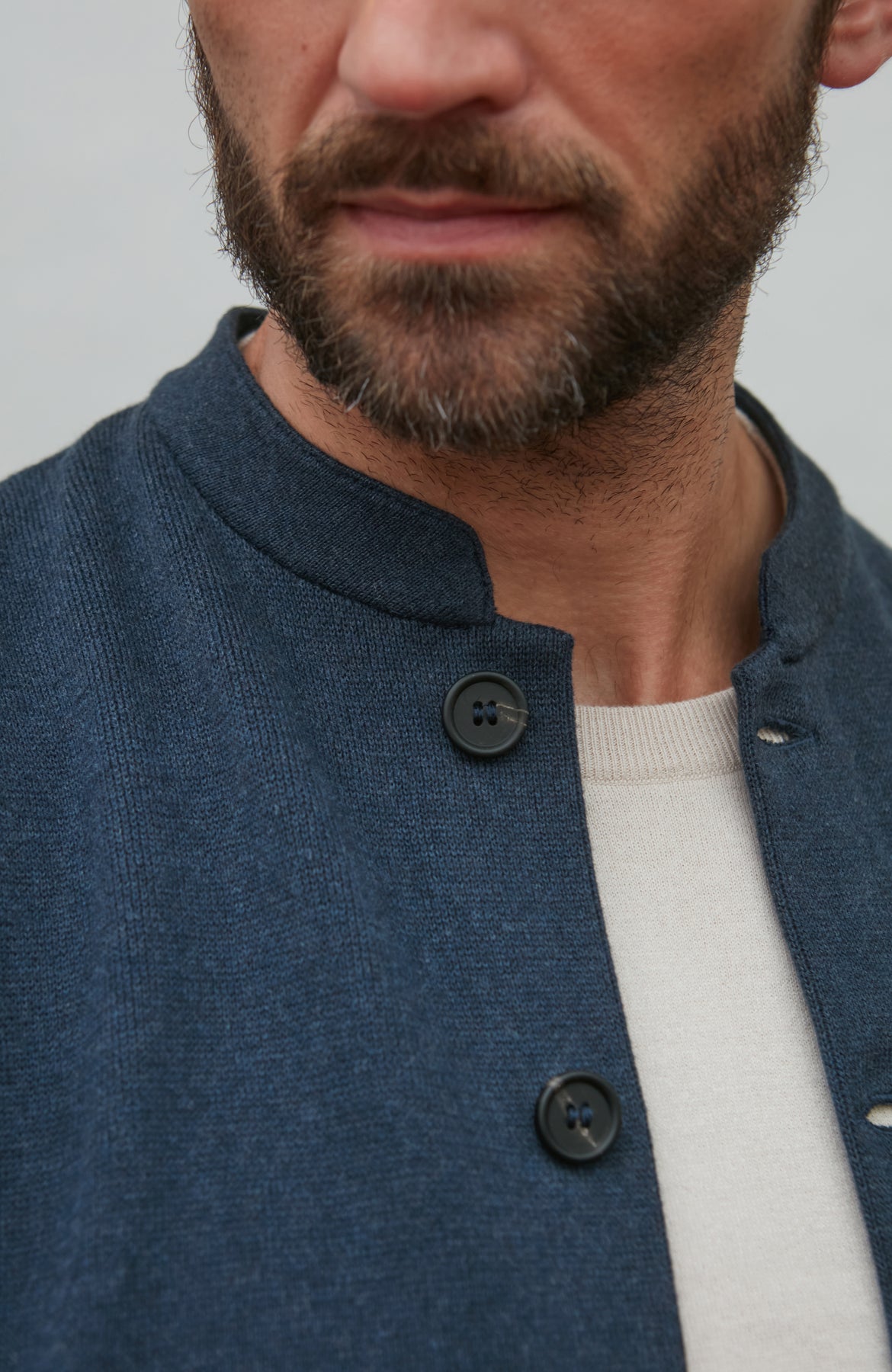 It features a half Milano base knit for stability and flexibility, with a double-layer Nehru collar for a sharp, minimal silhouette. Practical and elevated details include a chest patch pocket, two patch pockets above the hem, natural Italian-made buttons, and an internal button pocket, with a seamless front placket reinforced with internal tape for durability.