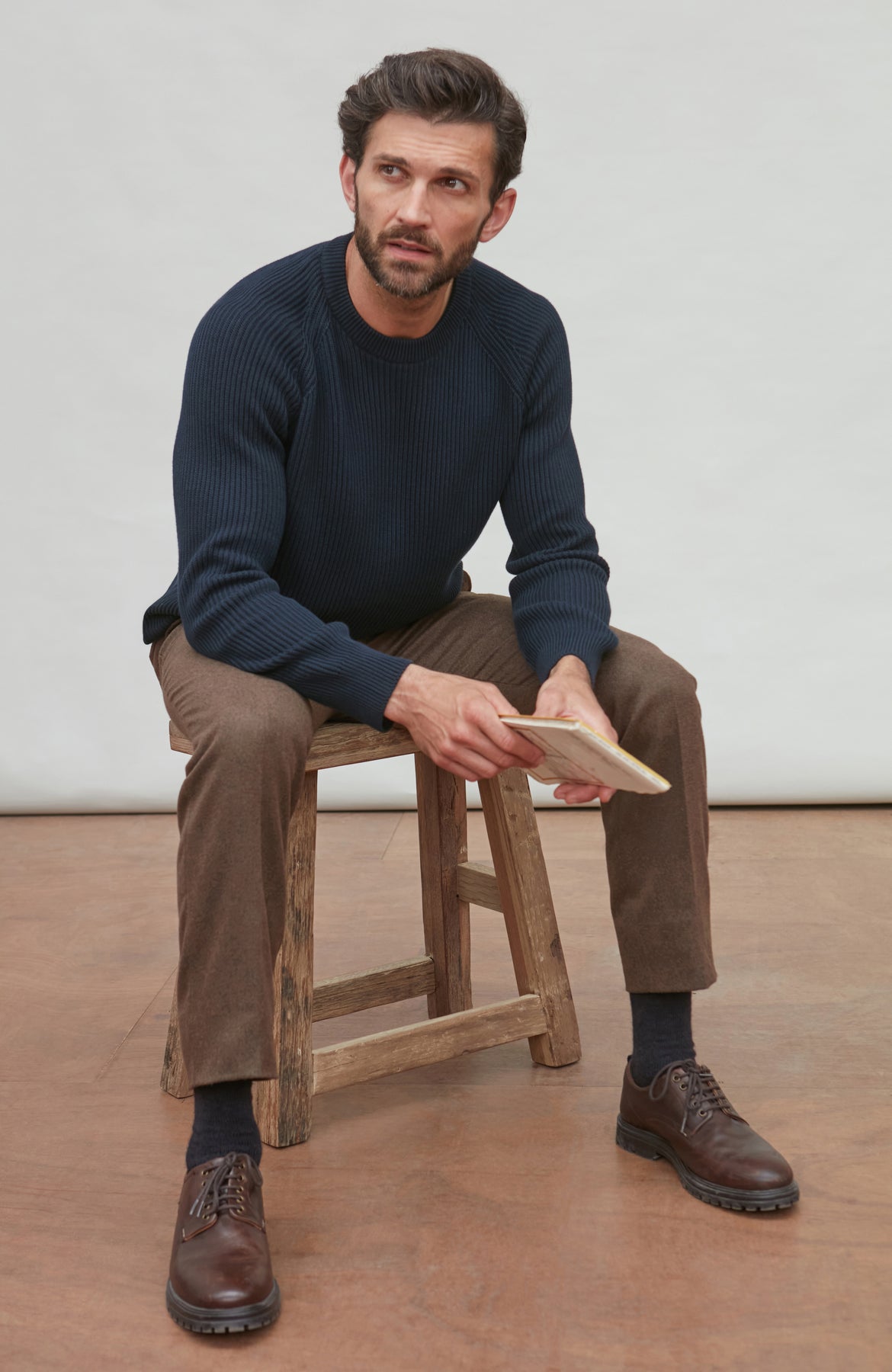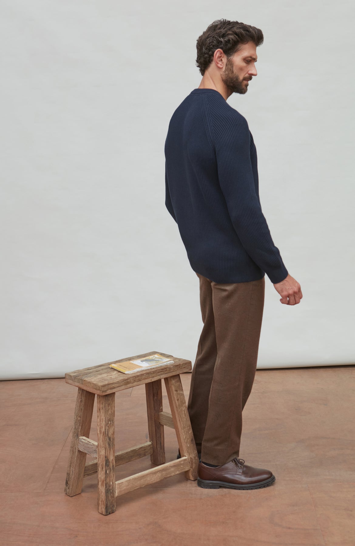 Logan is a classic fisherman rib crew neck jumper made from midweight cotton, designed for versatile layering and durable enough for everyday wear. Crafted using 100% Indian-grown and spun cotton and knitted using a full cardigan stitch, this low-maintenance, breathable, chunky sweater is perfect for the transitional months. Worn on its own, layered with fine wool or under a winter coat, the 7gg fabric has a beautifully balanced structure and softness.