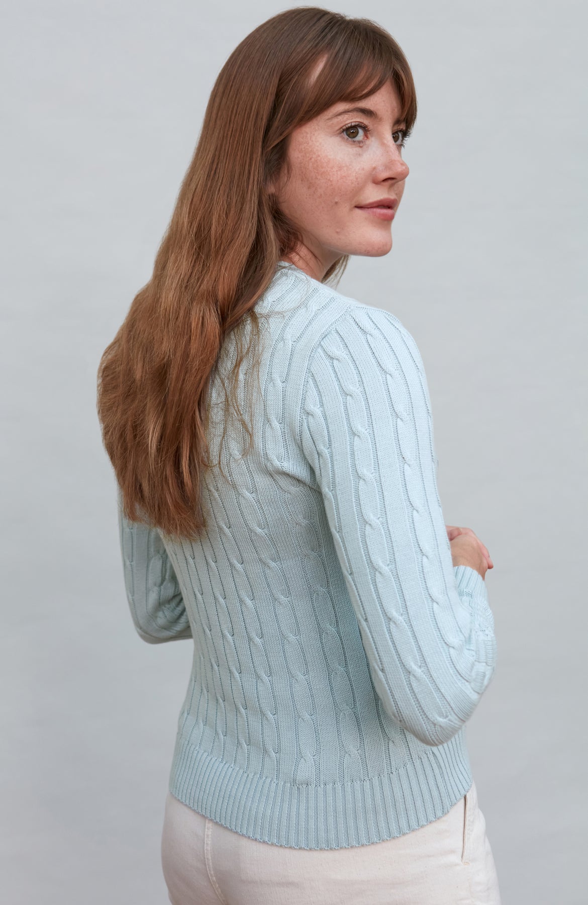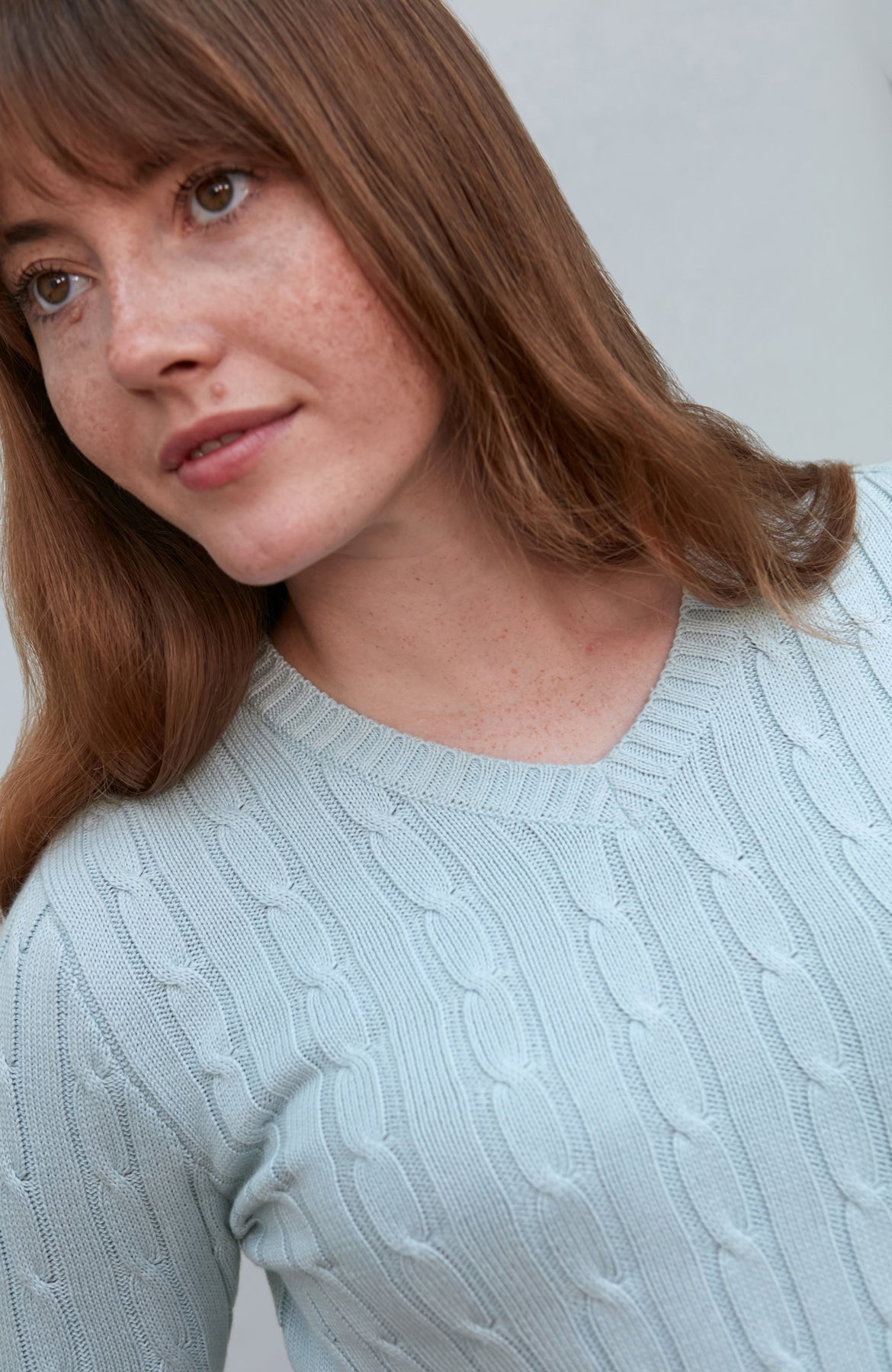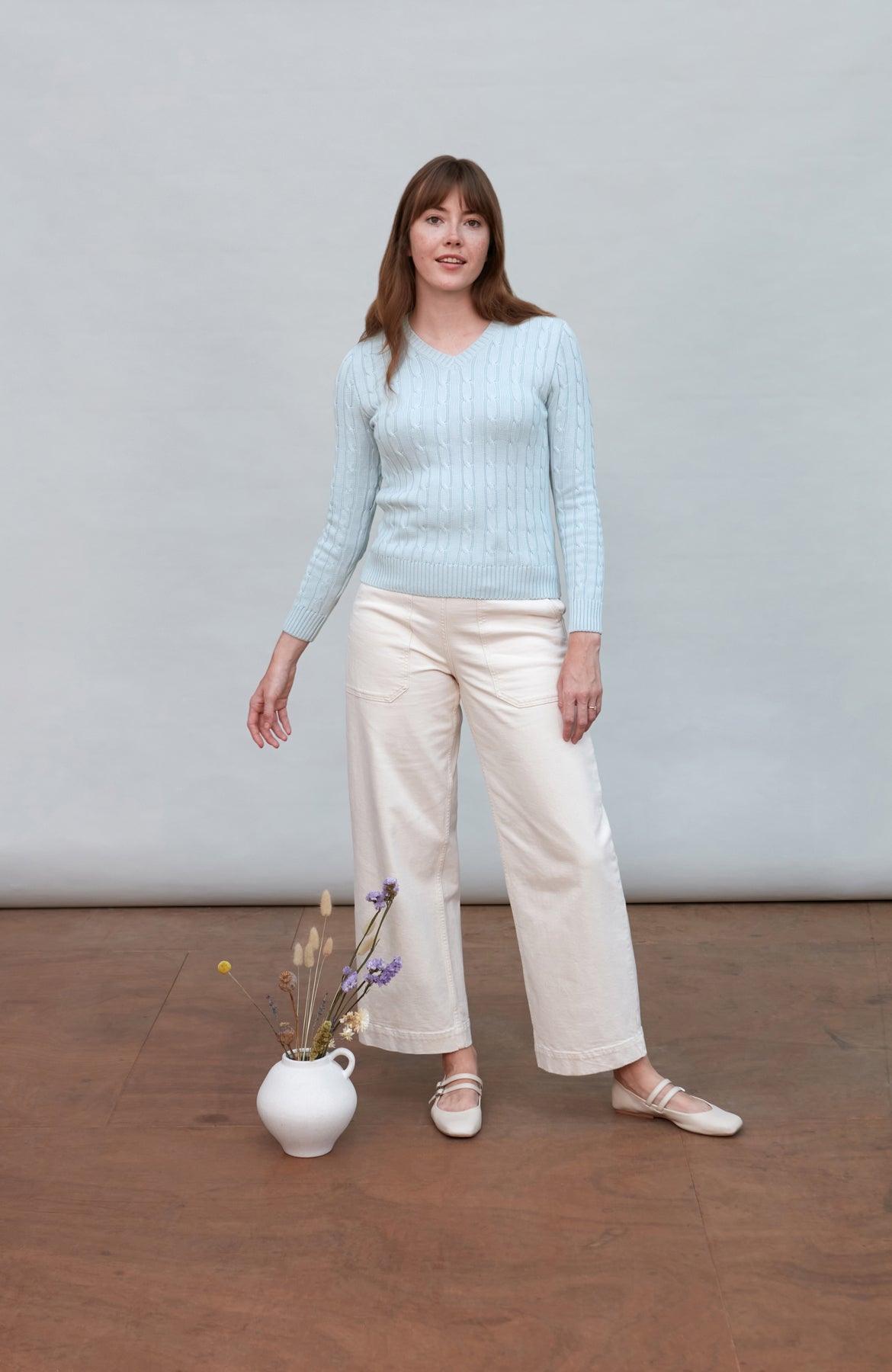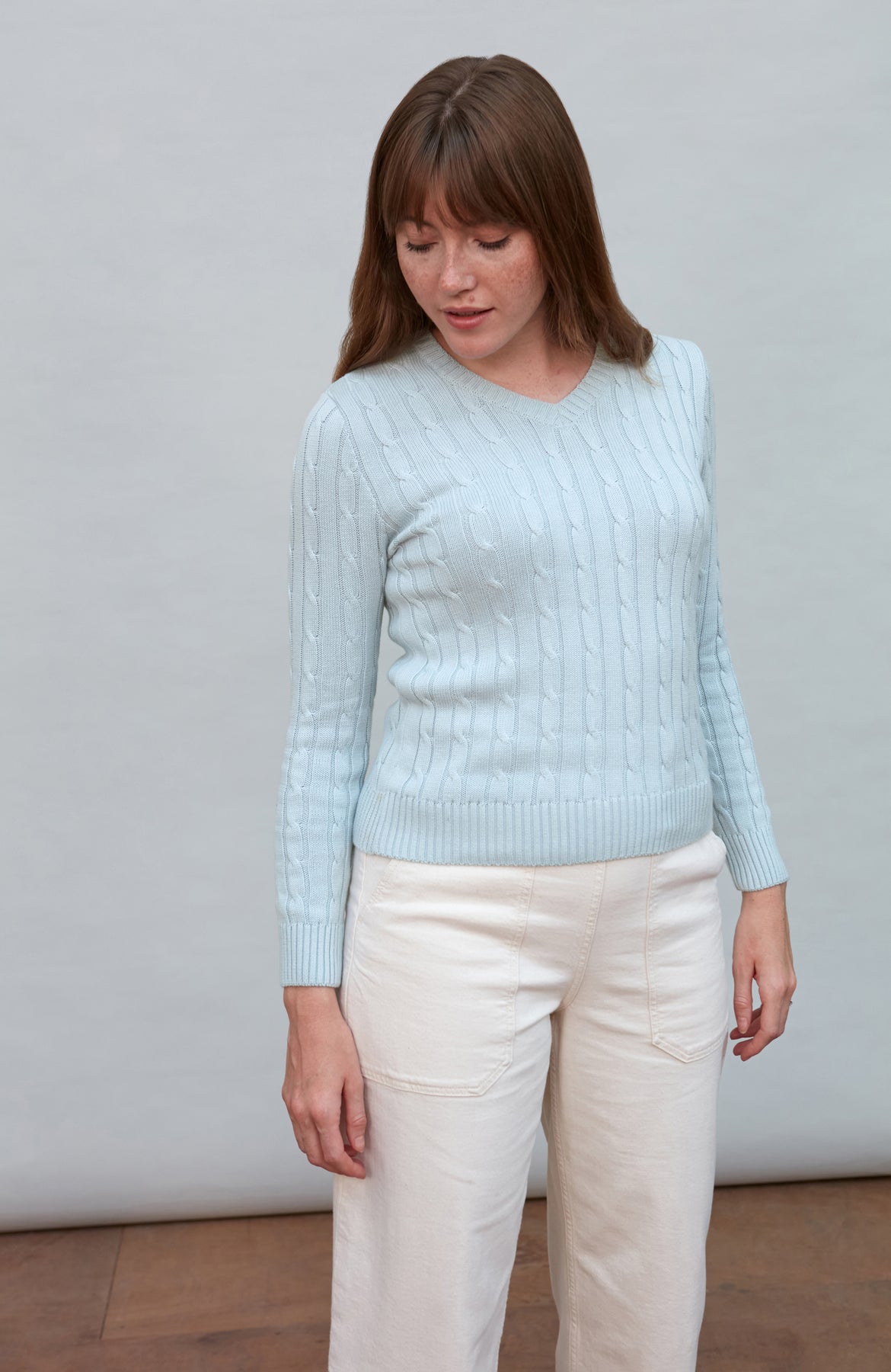 Damenpullover aus 100 % Baumwolle mit Zopfmuster und V-Ausschnitt