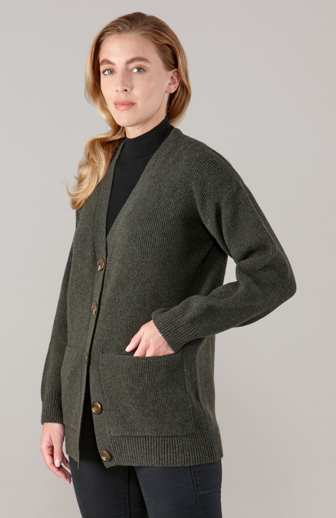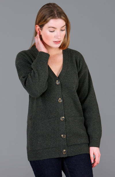 Unser mittelschwerer Rippstrick-Cardigan Layla ist ein kuscheliges Must-have für jeden Kleiderschrank und besteht aus weicher britischer gesponnener Lammwolle, hergestellt von Z. Hinchcliffe & Sons (gegründet 1766). Mit einer feinen Rippenstruktur für eine dickere Textur, einer entspannten Passform, einem tiefen V-Ausschnitt und Vordertaschen ist dieser praktische Strick die perfekte Ergänzung für Ihre Garderobe für die Übergangszeit.
