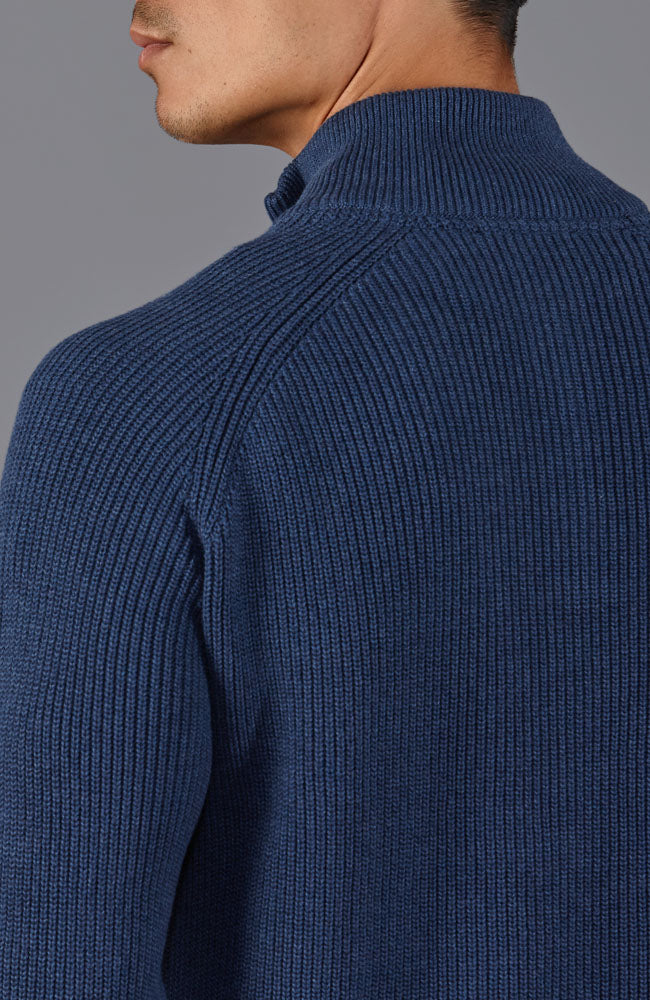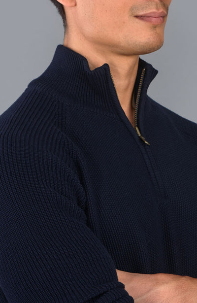 We've designed this zip neck sweater to be a trans-seasonal investment piece. The standing funnel neck is supported by a metal YKK zip which when combined will securely insulate you from the wind. The fabric is thick and features a contrasting stitch detail across the shoulders and arms which deliver a masculine profile to this sturdy jumper.