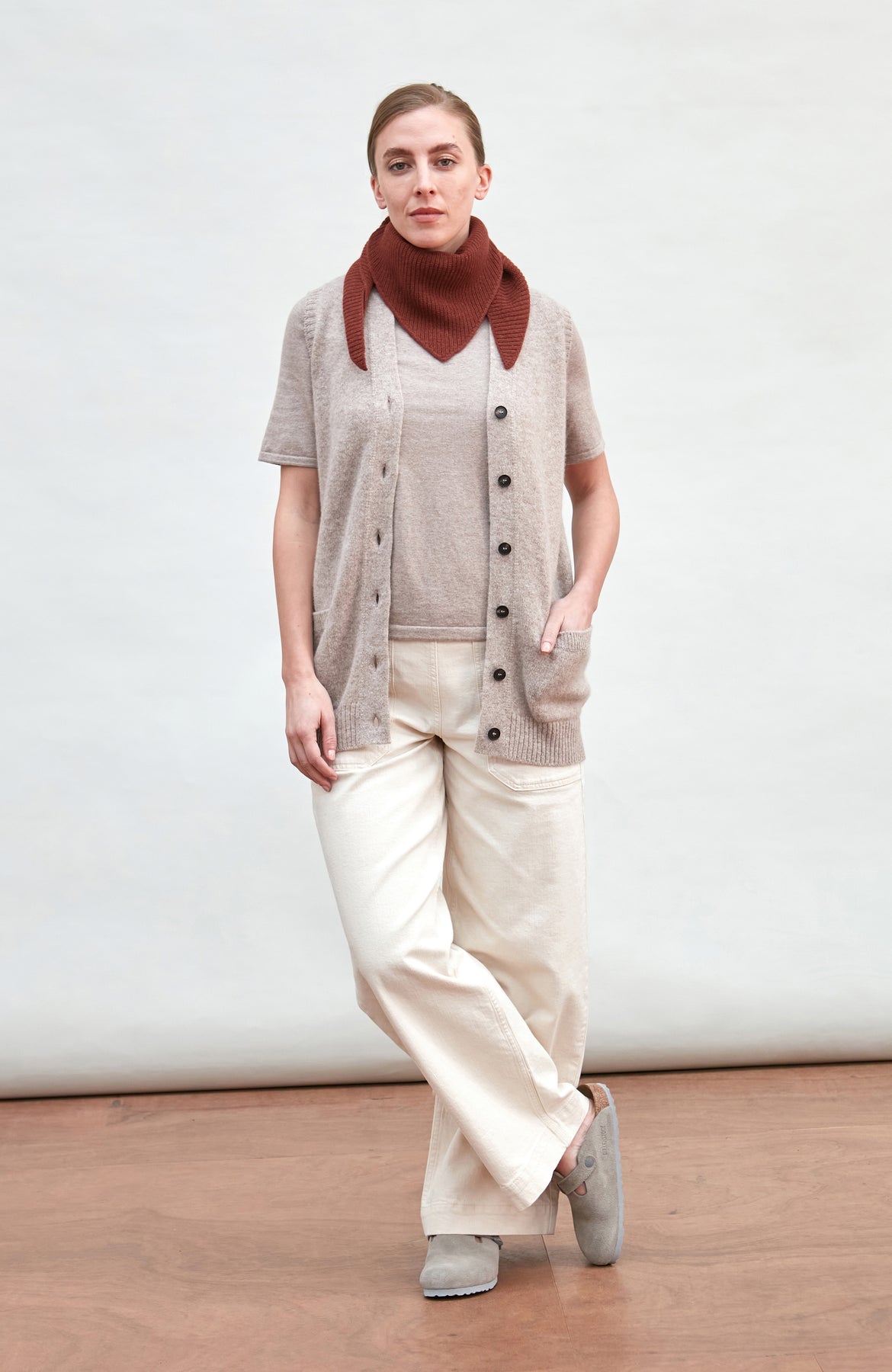 Knitted in a timeless all-over half-cardigan rib stitch with self-finished edges, this scarf adds an elegant touch to your look. The generous triangular shape allows for effortless styling - wear it knotted at the neck, over the head to protect the ears, draped over the shoulders, or wrapped like a shawl.
