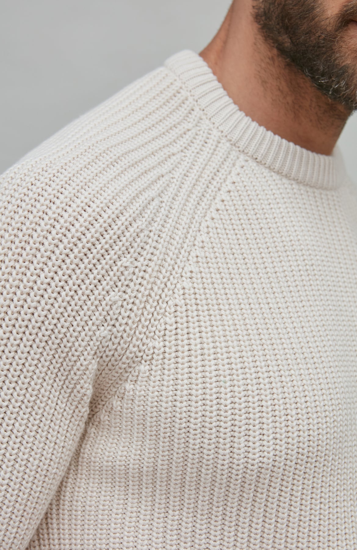 Close-up of a ecru fisherman rib knit sweater on a neutral background