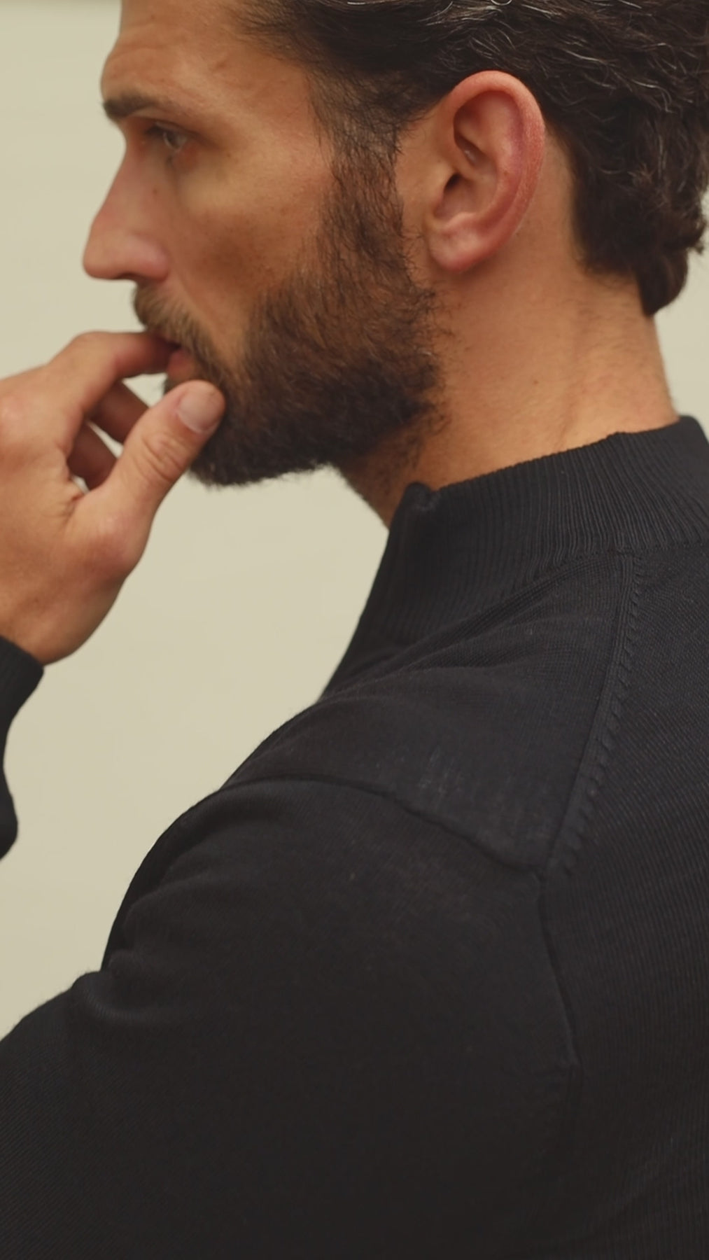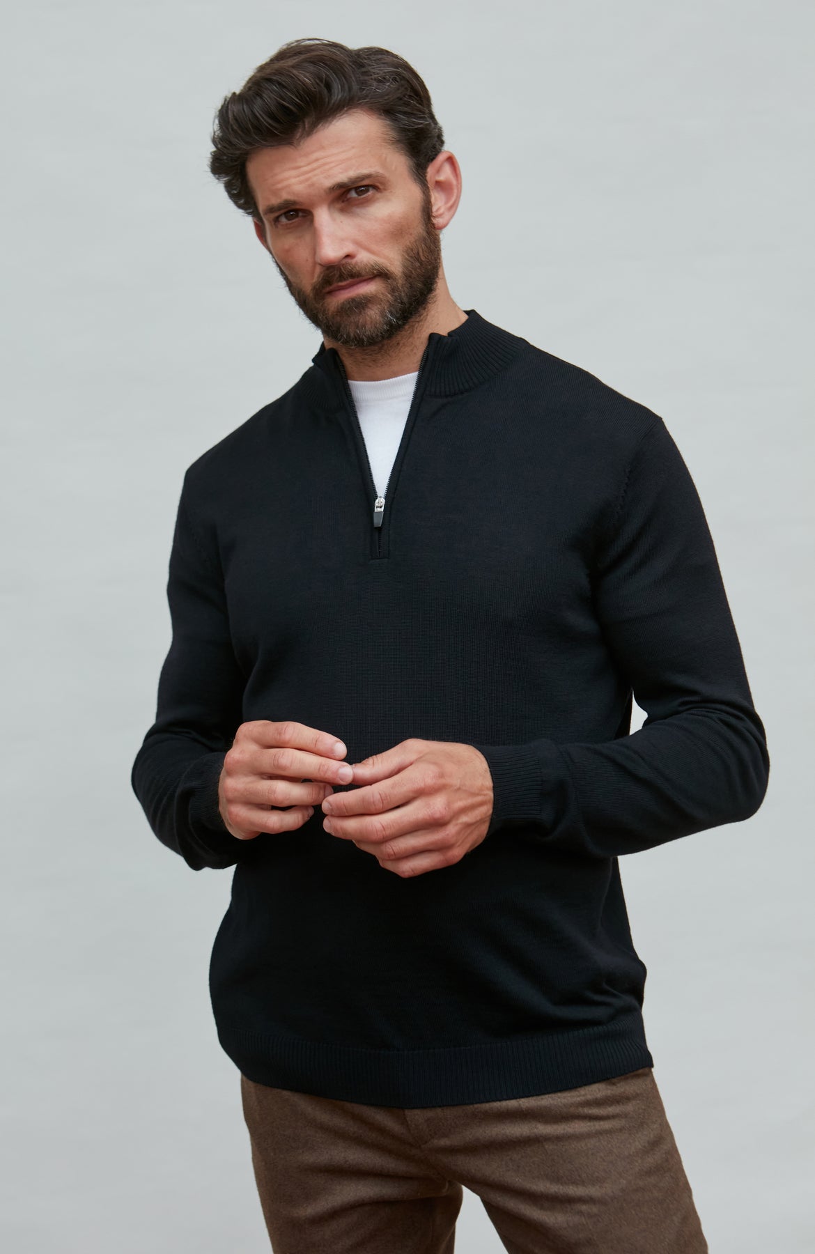 Man wearing a black quarter-zip merino wool sweater against a gray background