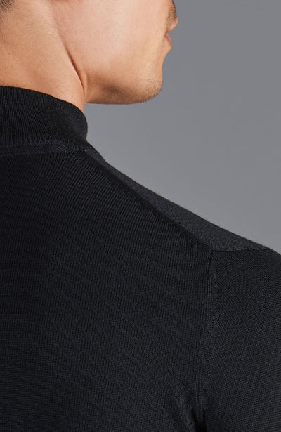 A contemporary twist on the classic roll neck, this thin pure wool mock turtleneck is a testament to modern elegance. Crafted from 100% Italian-spun, extra-fine merino, it offers unparalleled comfort and versatility for any occasion.