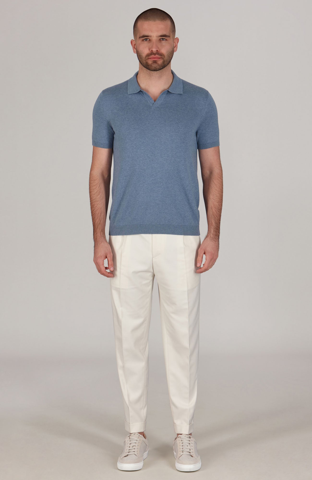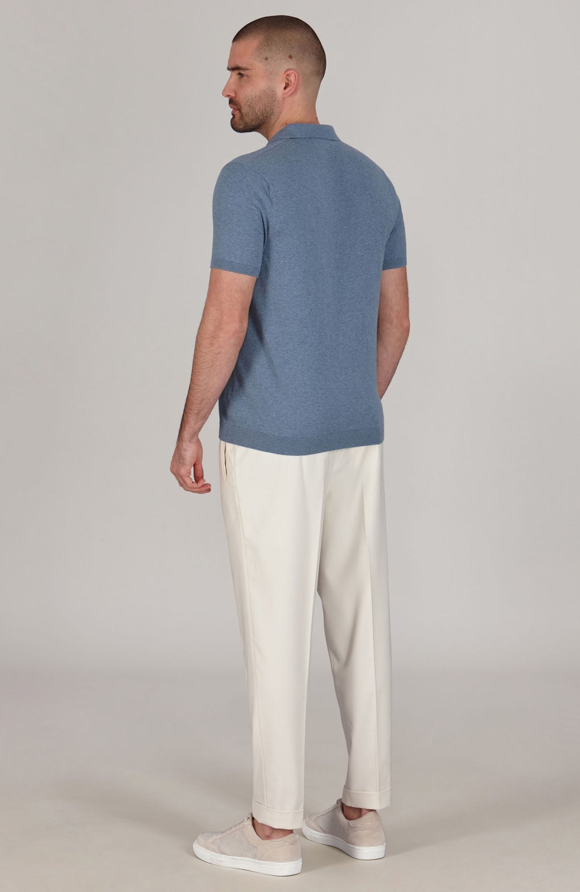 Man wearing a blue polo shirt and dark pants against a plain background