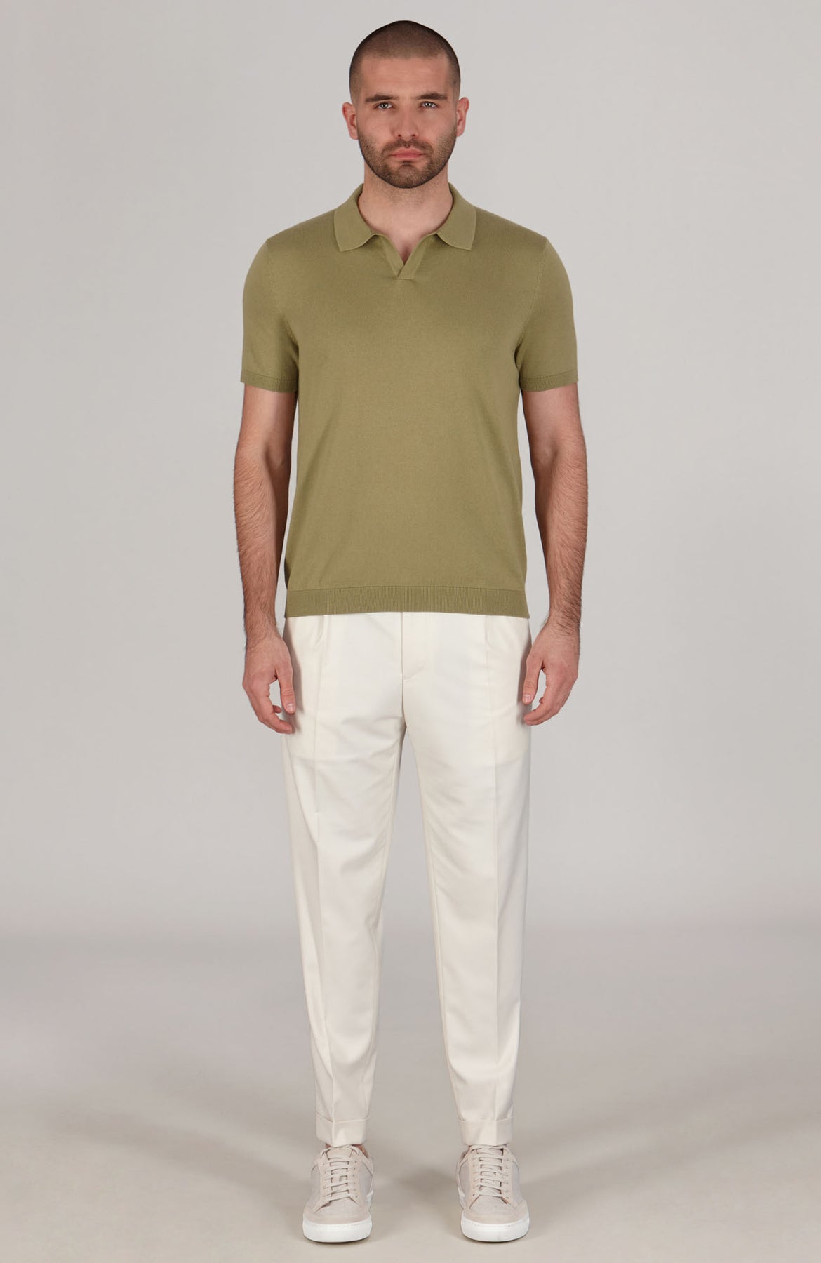 Man wearing a green polo shirt and gray pants against a plain background