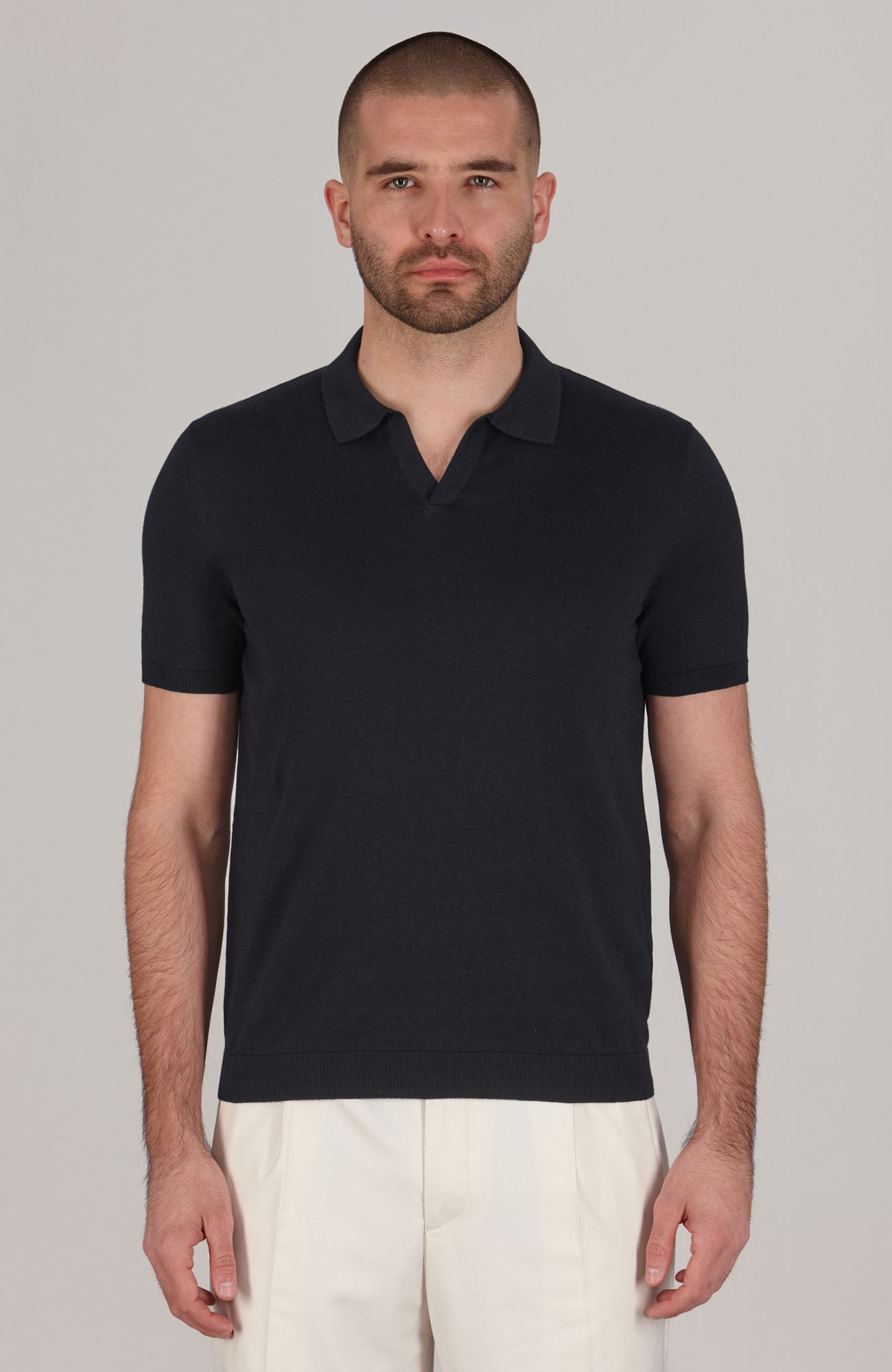 A male model wearing a short-sleeved, buttonless, BLACK polo neck sweater with an open collar.