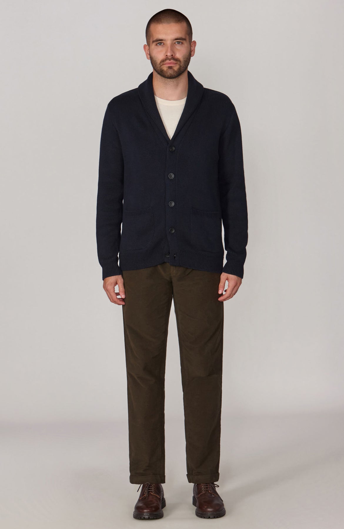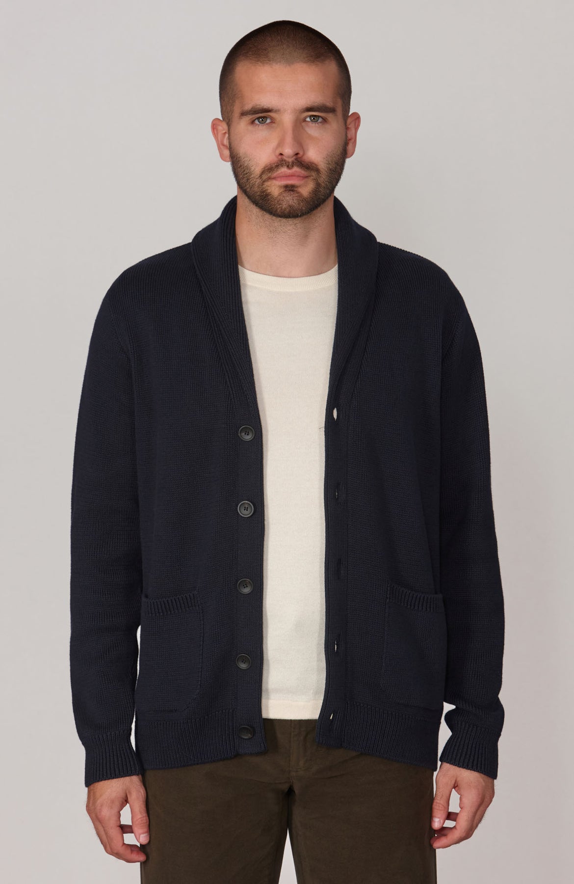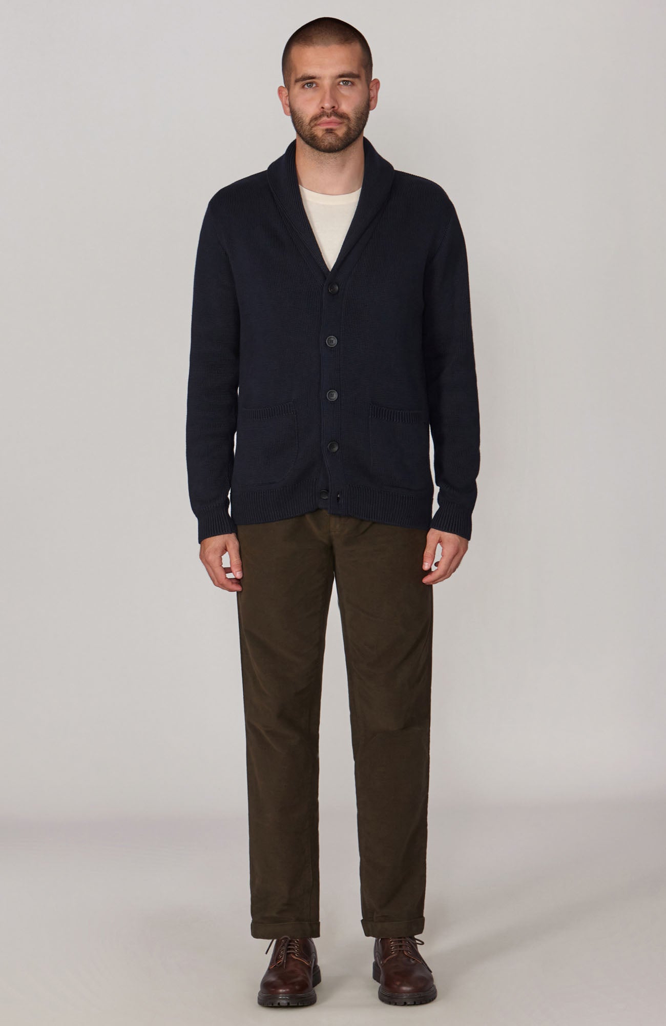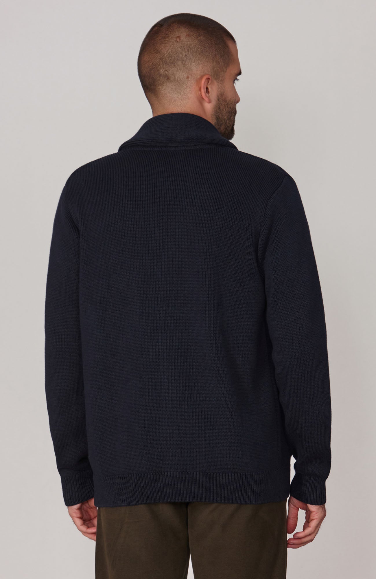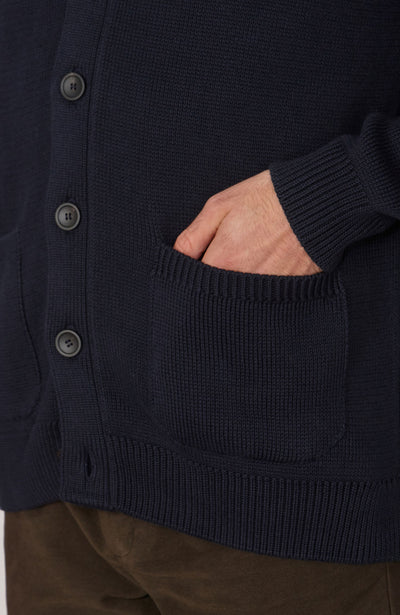 Offering a more elegant take on a traditional men's cardigan, Sebastian is a midweight knit with a ribbed shawl collar and two practical front pockets. First introduced on Victorian smoking jackets, the collar adds a refined feel to the silhouette of this knit and creates a warm layer for colder times.