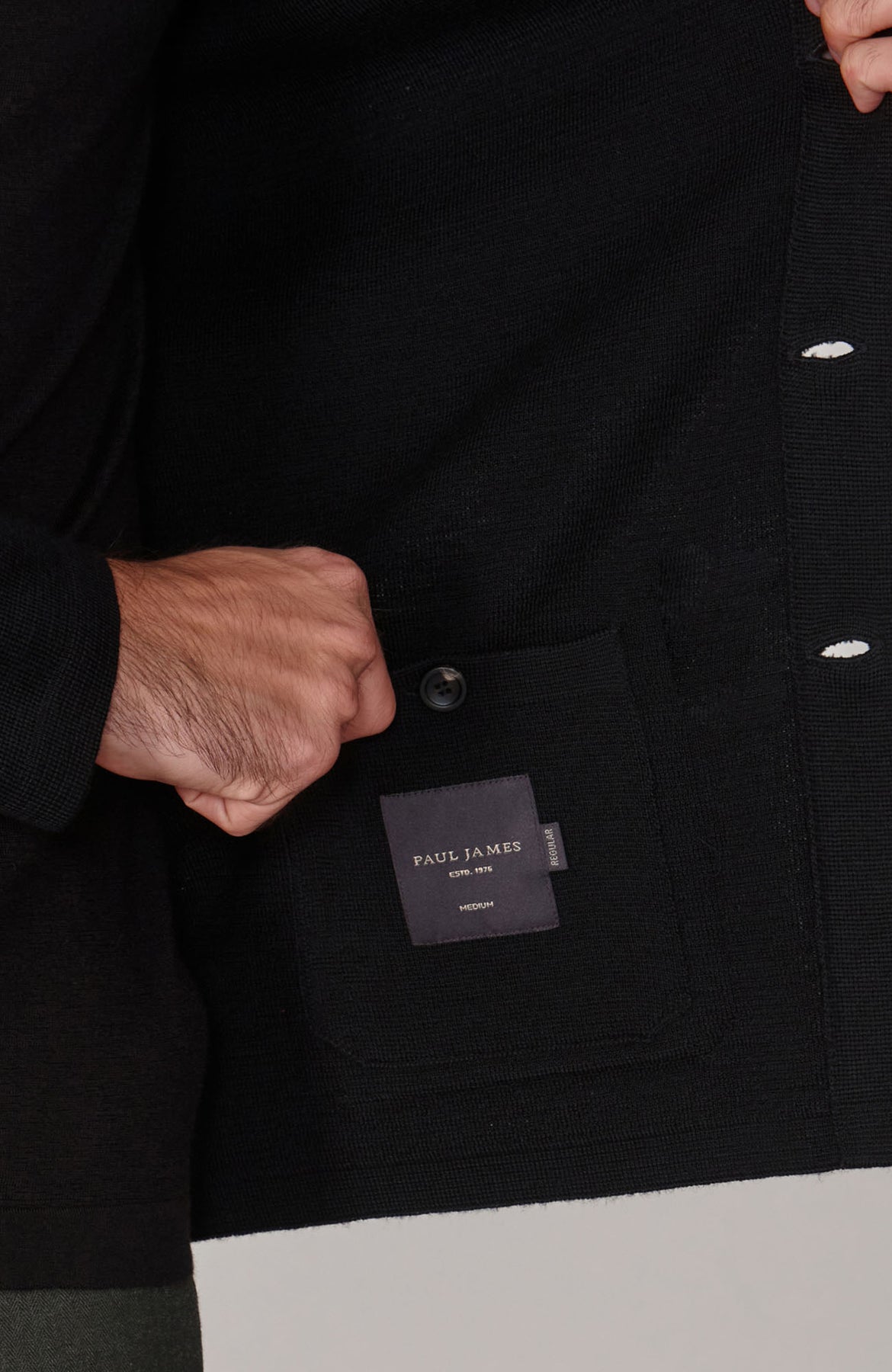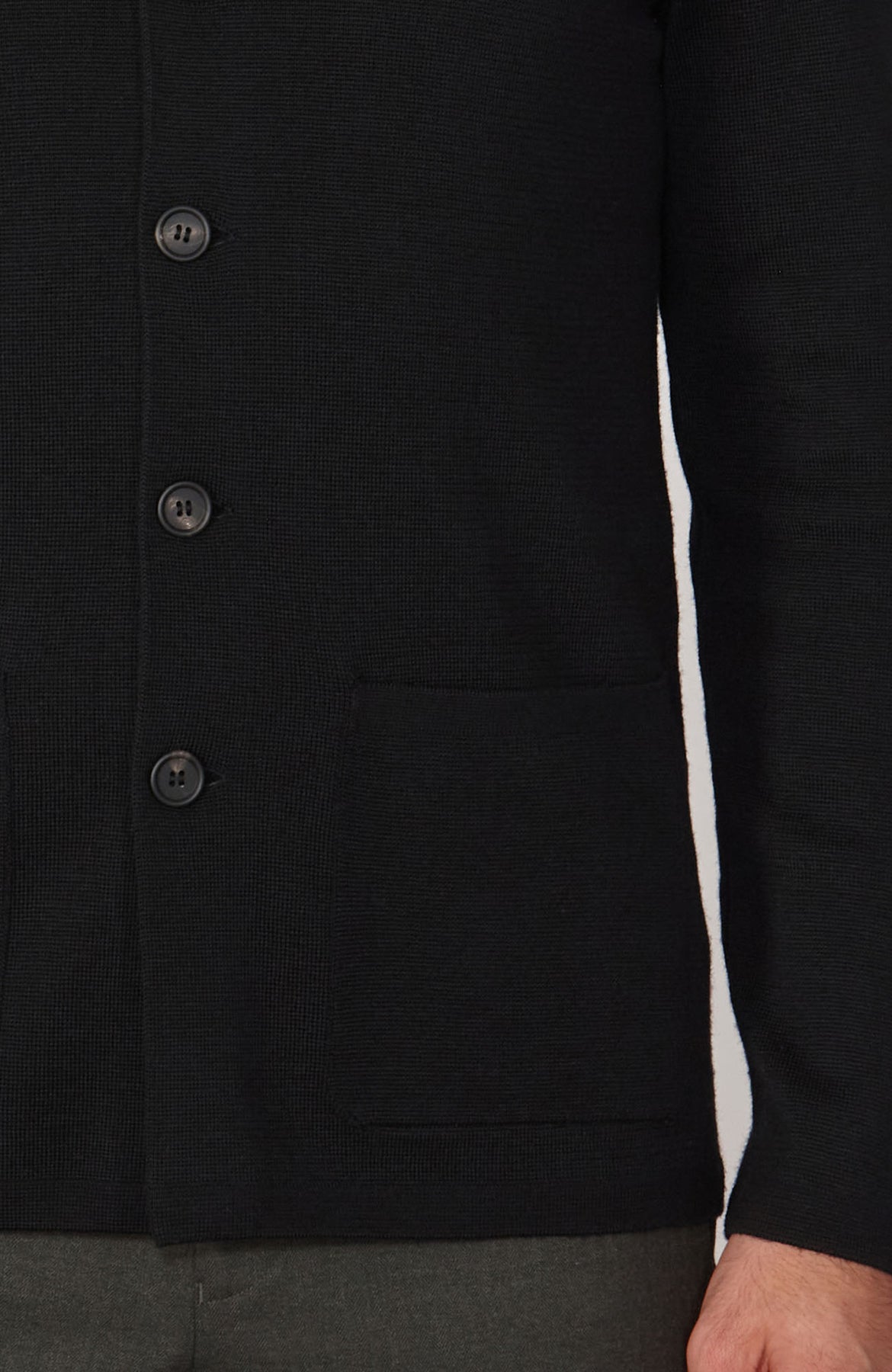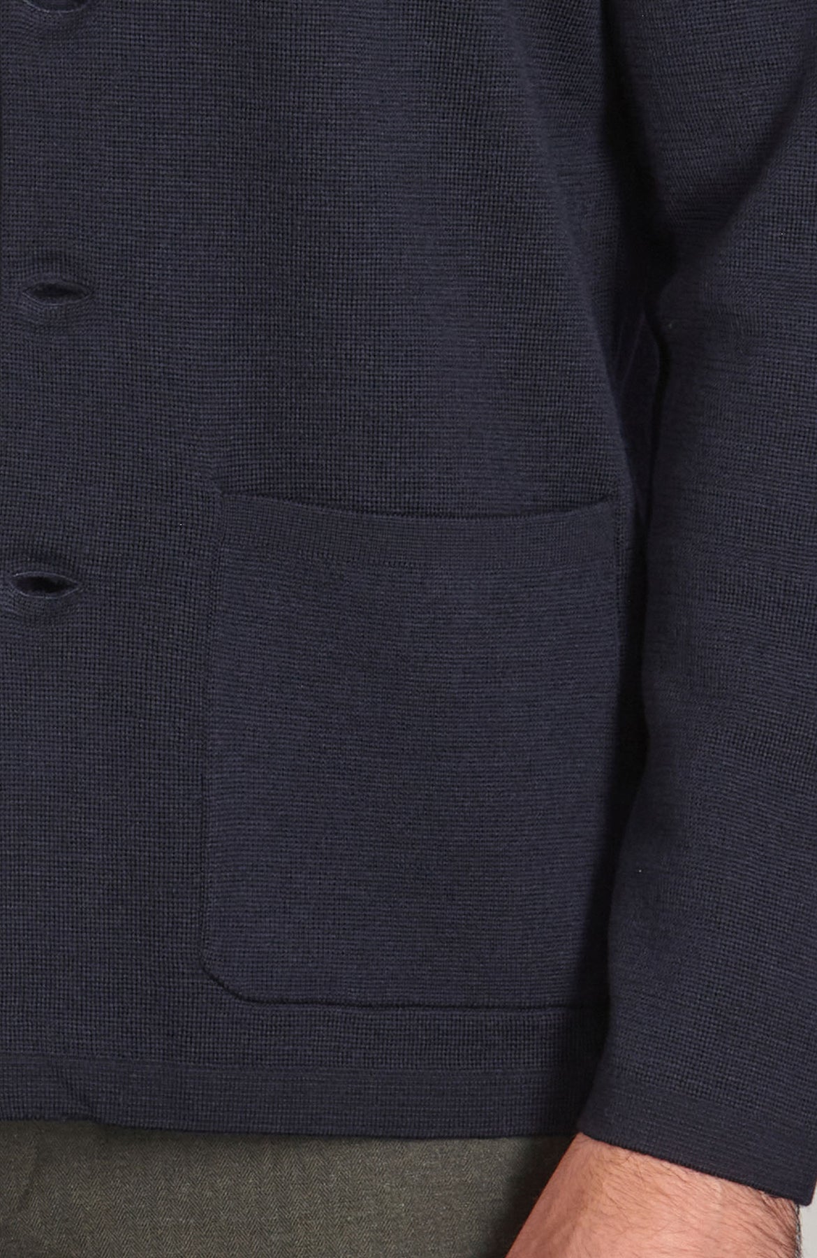 Details include a mock chest welt pocket, two patch pockets, an internal buttoned pocket, natural Italian-made buttons, a hook collar closure, and full Milano knit trims for durability and shape retention.