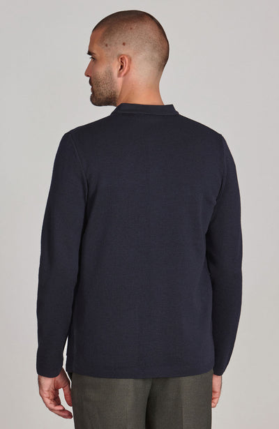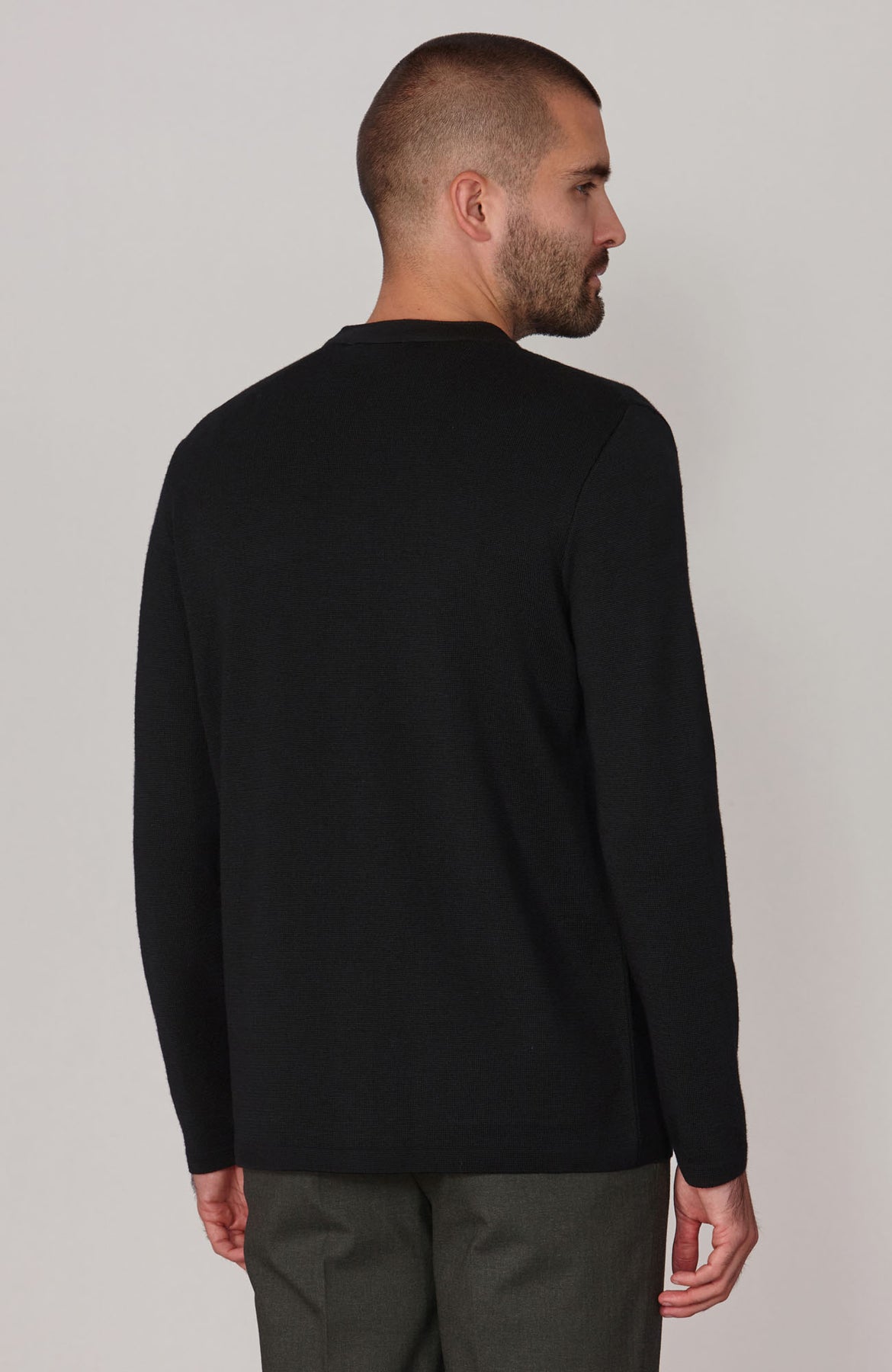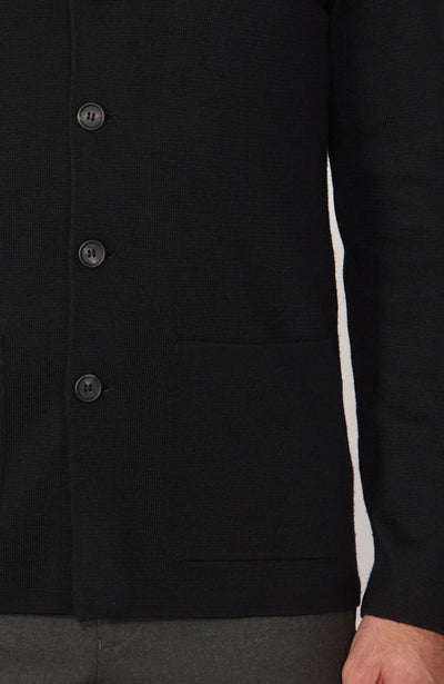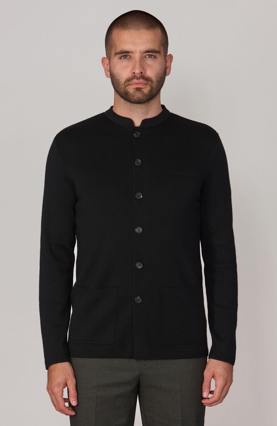 Featuring a structured double-layer mandarin collar, half-Milano knit construction, and a relaxed, deconstructed silhouette, the Alonzo offers the sophistication of tailoring with the comfort of knitwear.