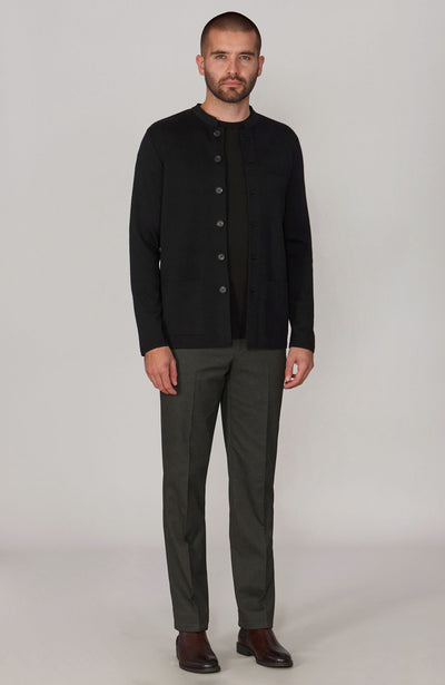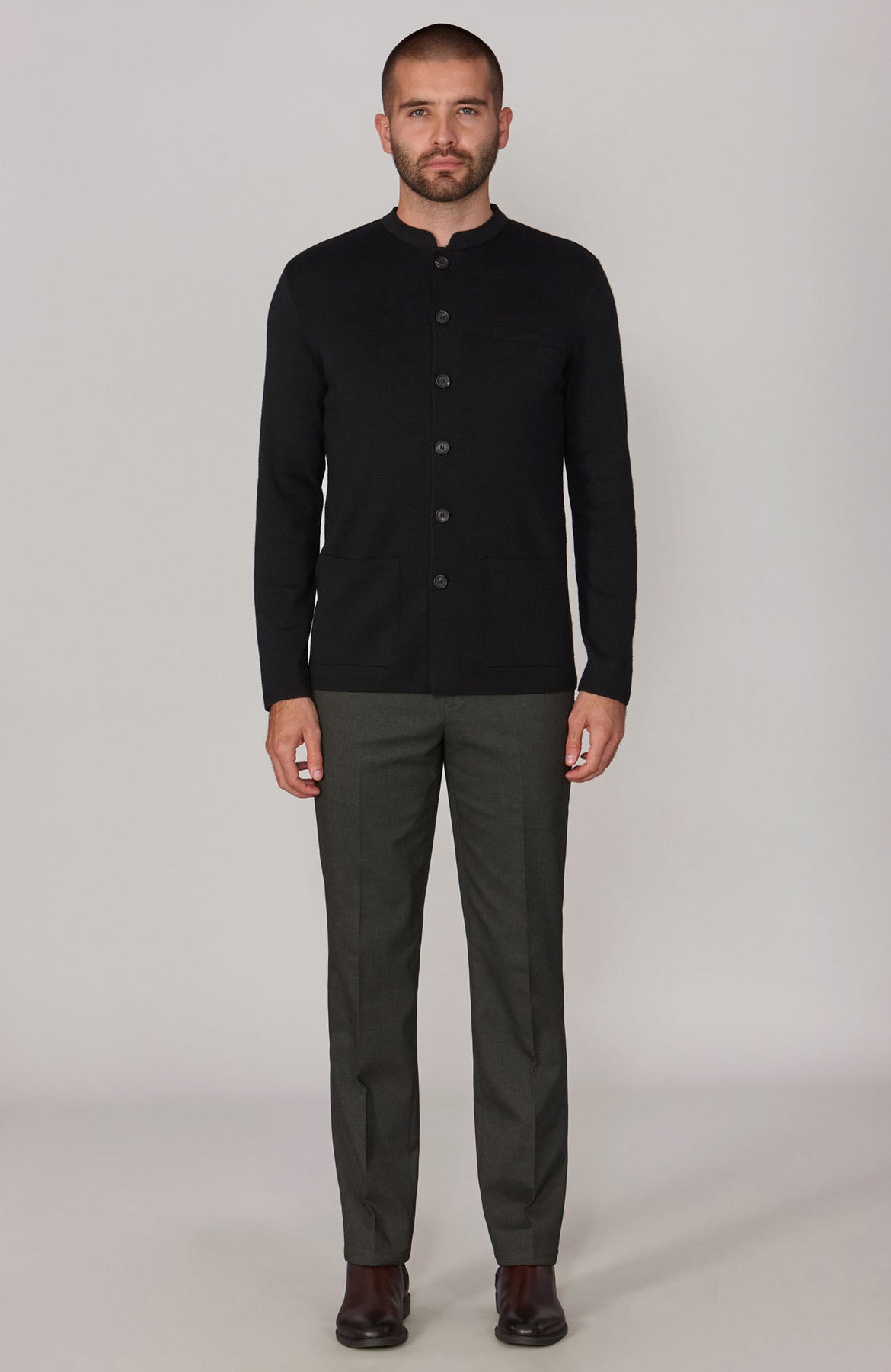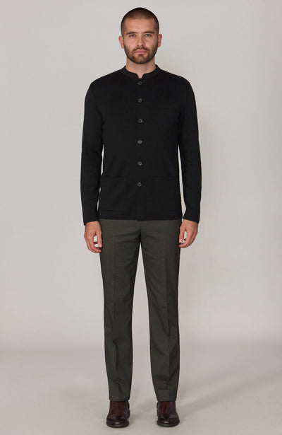 Man wearing a black mandarin collar jacket in fine wool over a white shirt and green pants against a light gray background
