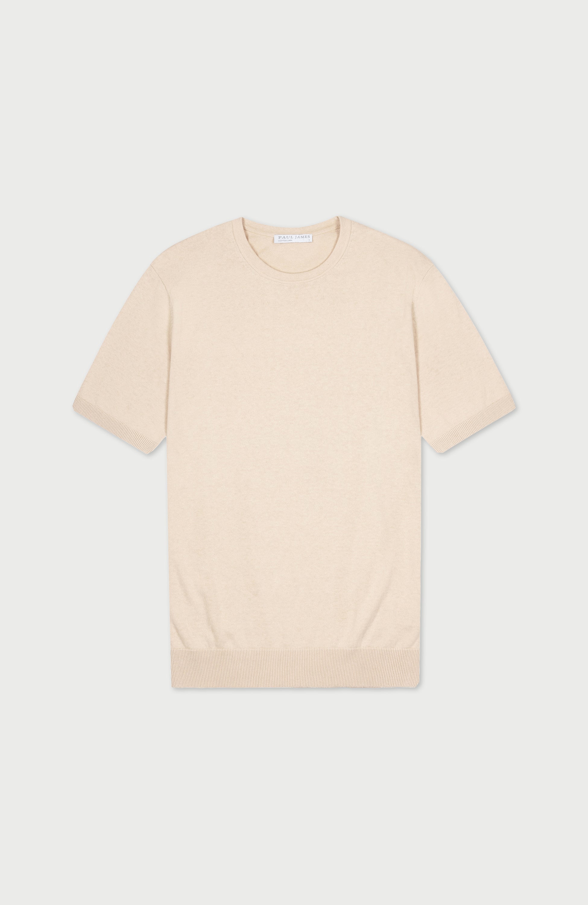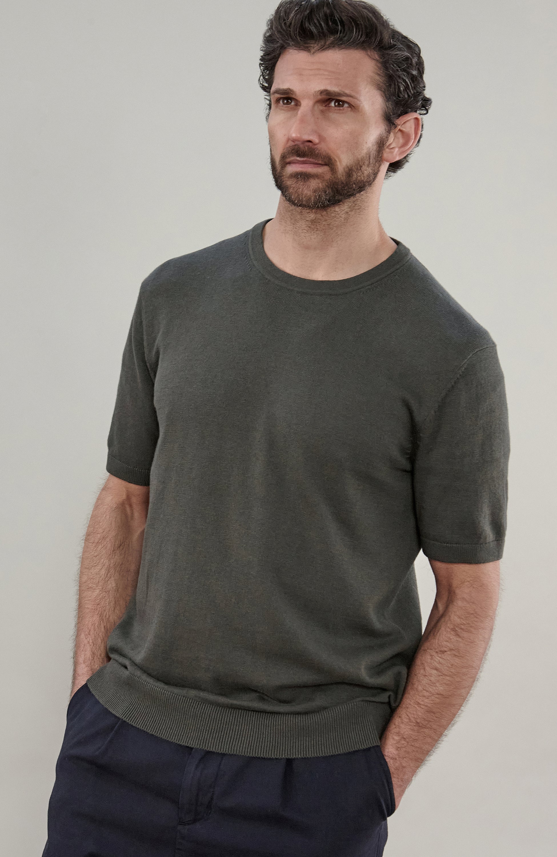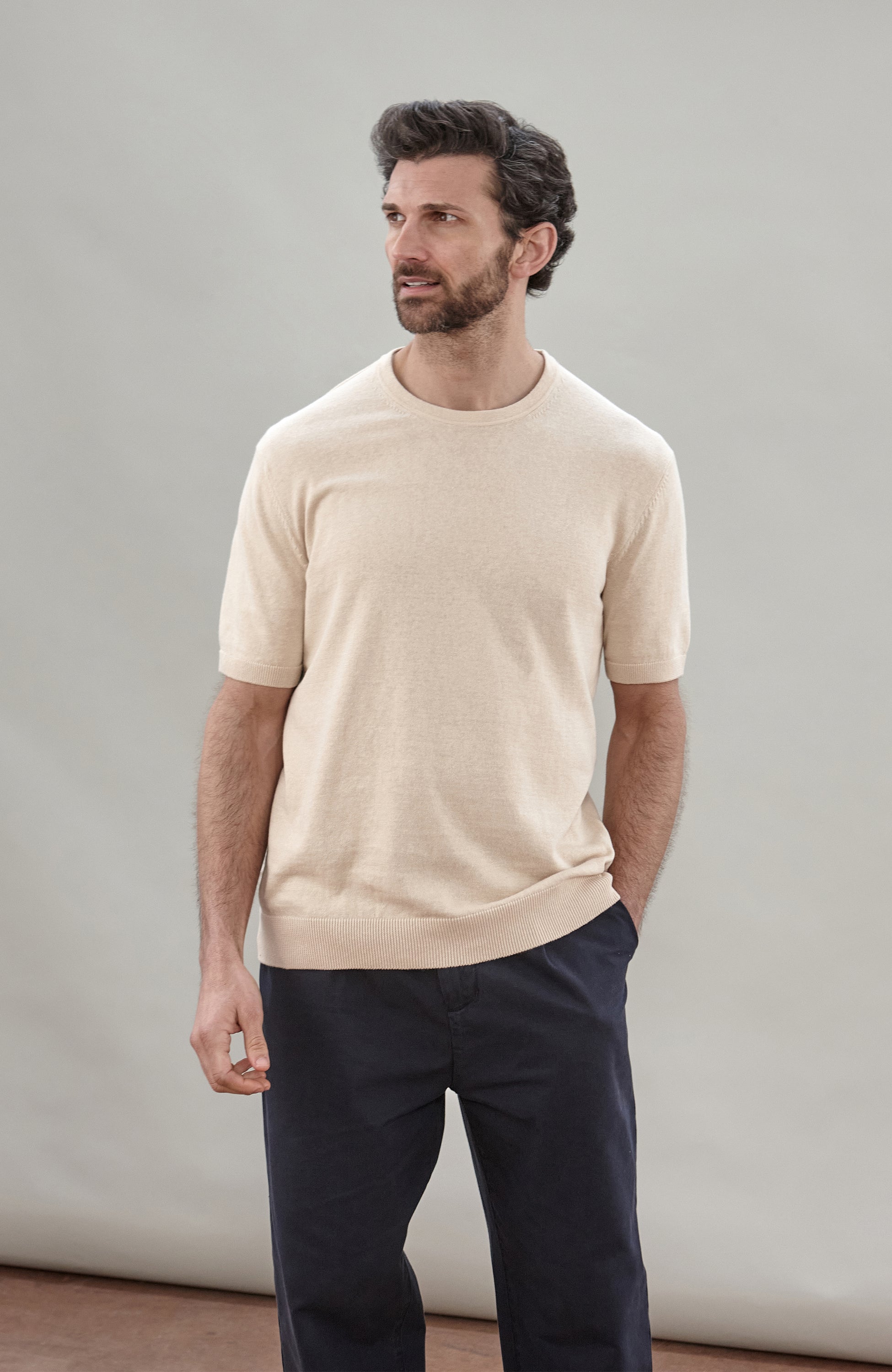 Arin is a refined crew neck short-sleeve knitted jumper crafted from a breathable blend of organic cotton and linen, designed to elevate warm-weather dressing. The addition of linen brings a dry, airy handle, while organic cotton softens the feel against the skin. Finished with a structured ribbed hem and cuffs, it offers a cleaner, more tailored silhouette than a standard T-shirt, making it particularly well suited to pairing with tailored trousers and blazers.
