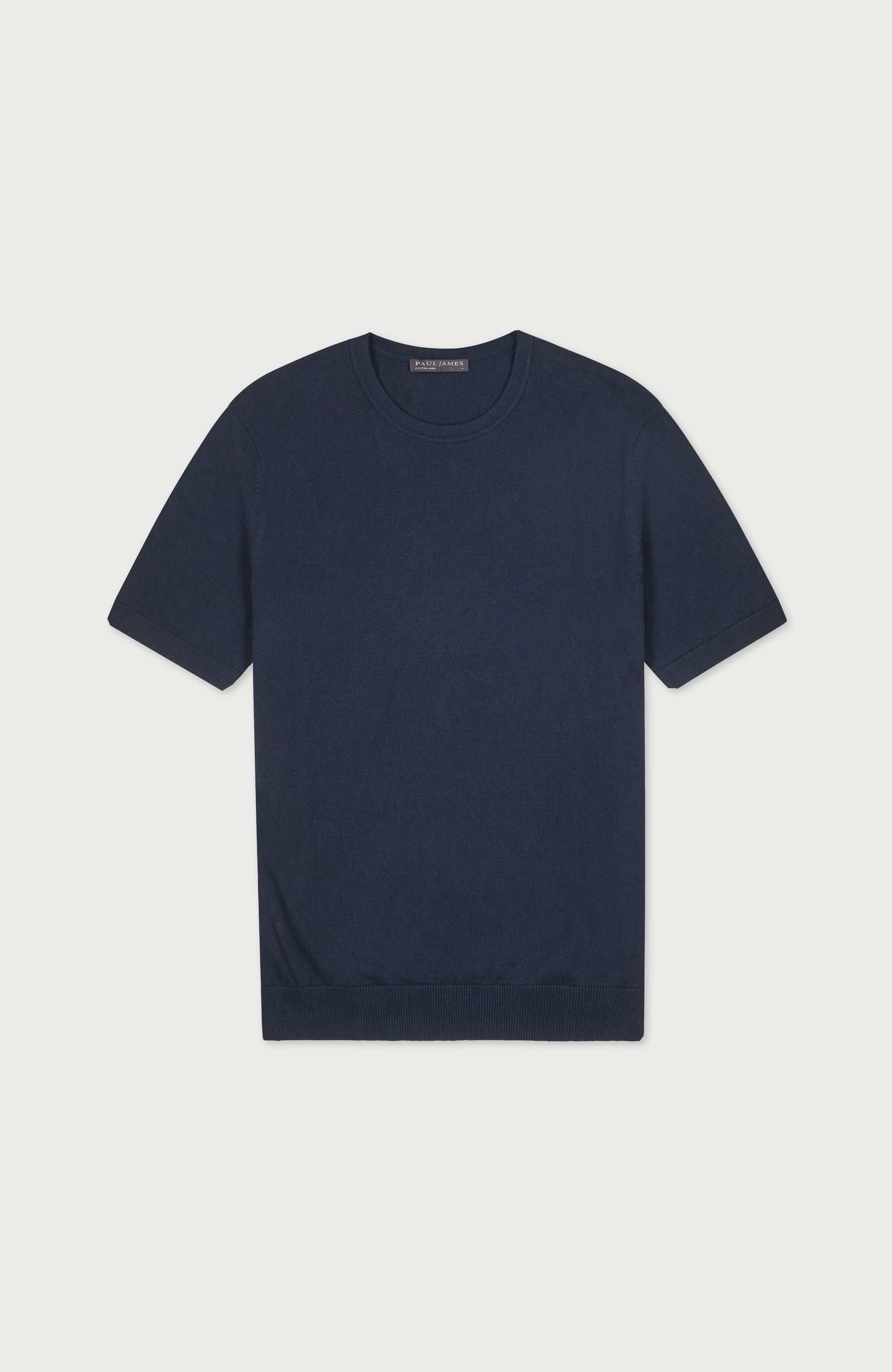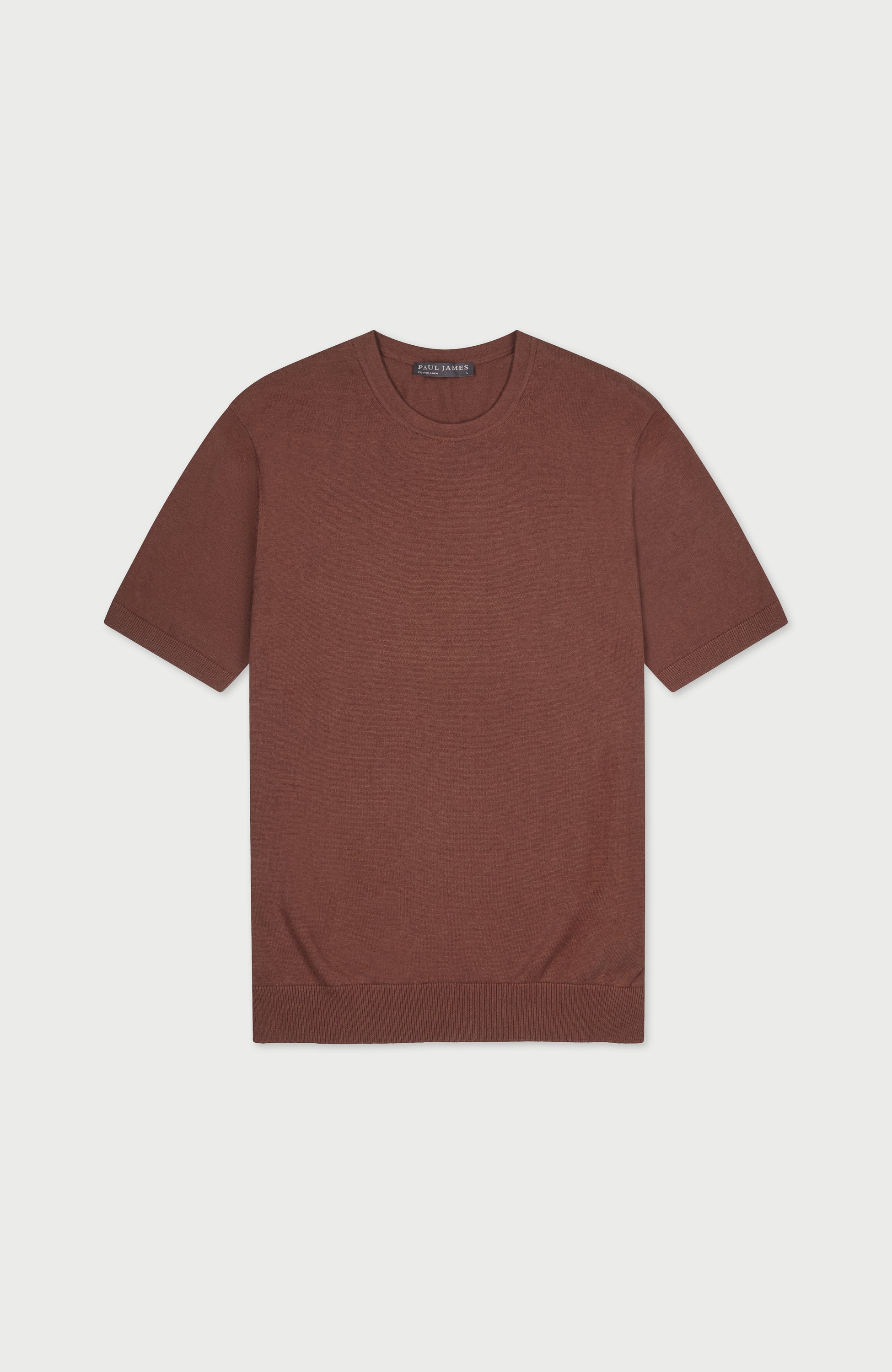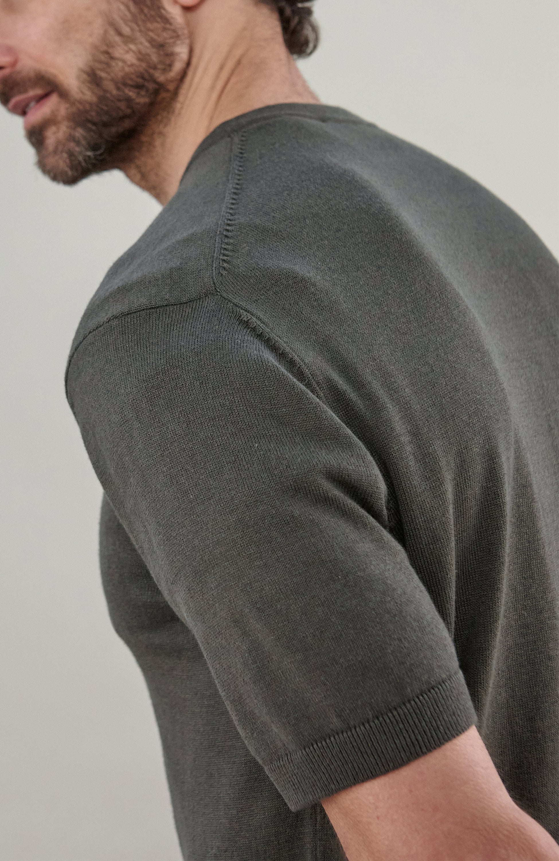 Arin is a refined crew neck short-sleeve knitted jumper crafted from a breathable blend of organic cotton and linen, designed to elevate warm-weather dressing. The addition of linen brings a dry, airy handle, while organic cotton softens the feel against the skin. Finished with a structured ribbed hem and cuffs, it offers a cleaner, more tailored silhouette than a standard T-shirt, making it particularly well suited to pairing with tailored trousers and blazers.