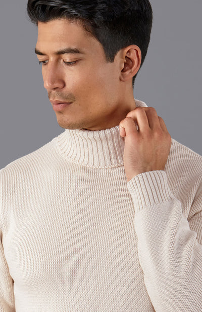 A modern fitting twist to our Heavyweight 100% Cotton Submariner sweater, our midweight Harrison roll neck sweater has a set-in sleeve for a slimmer profile through the arms and body.