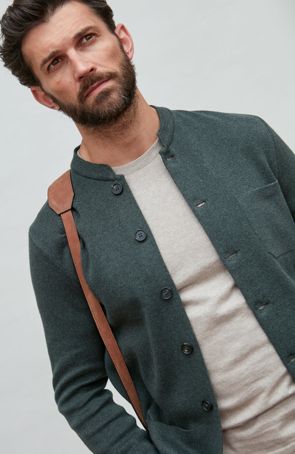 Man wearing a dark green mandarin collar  jacket over a white shirt with a brown strap over his shoulder on a light gray background