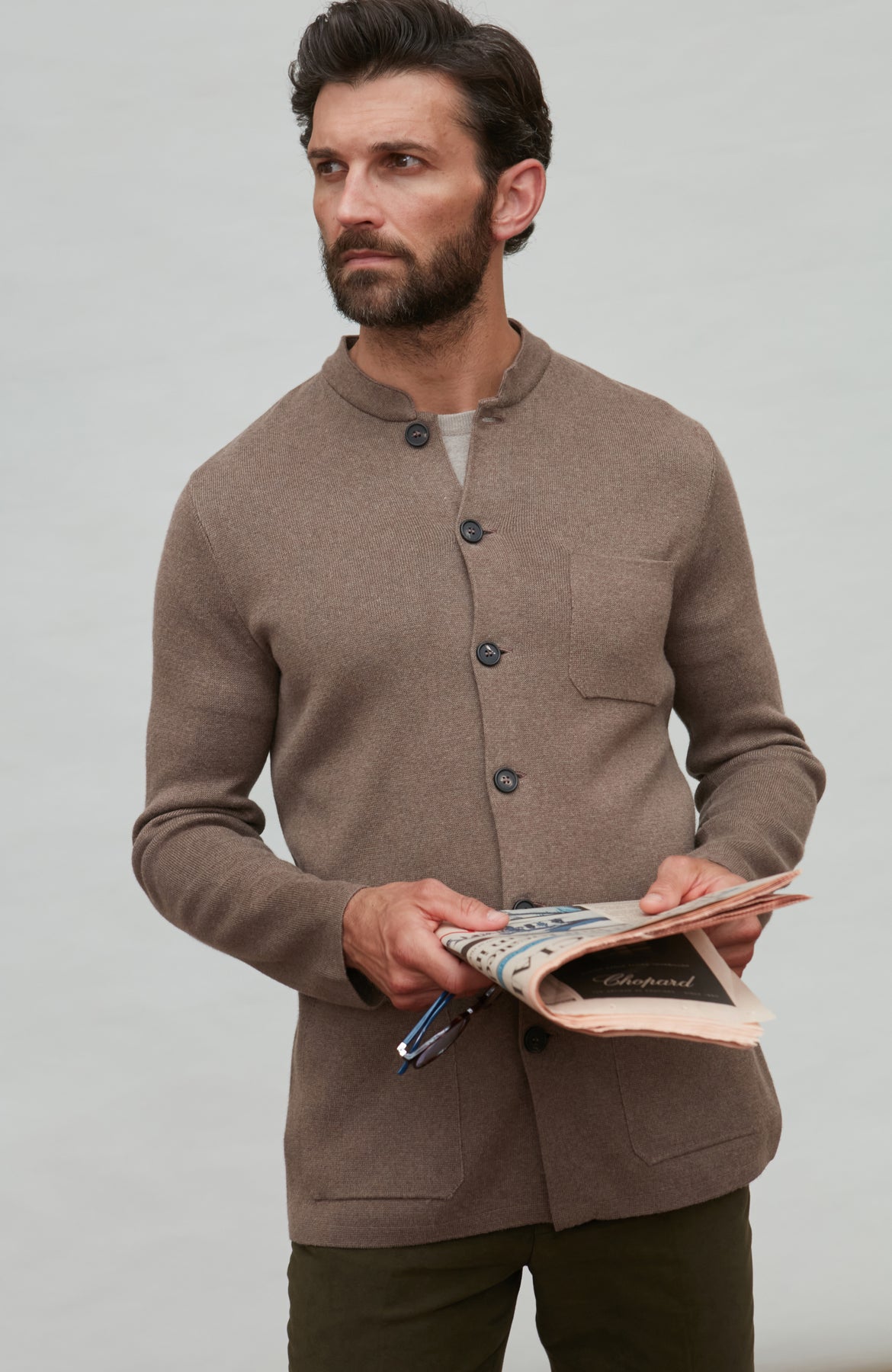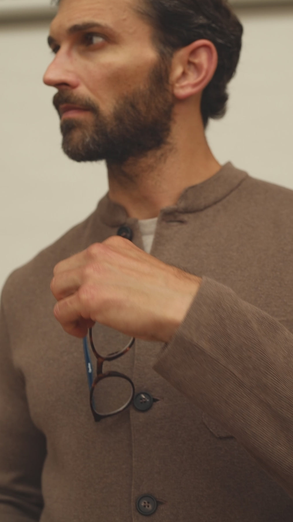 Close-up of a person wearing a brown mandarin collar jacket with buttons on a neutral background