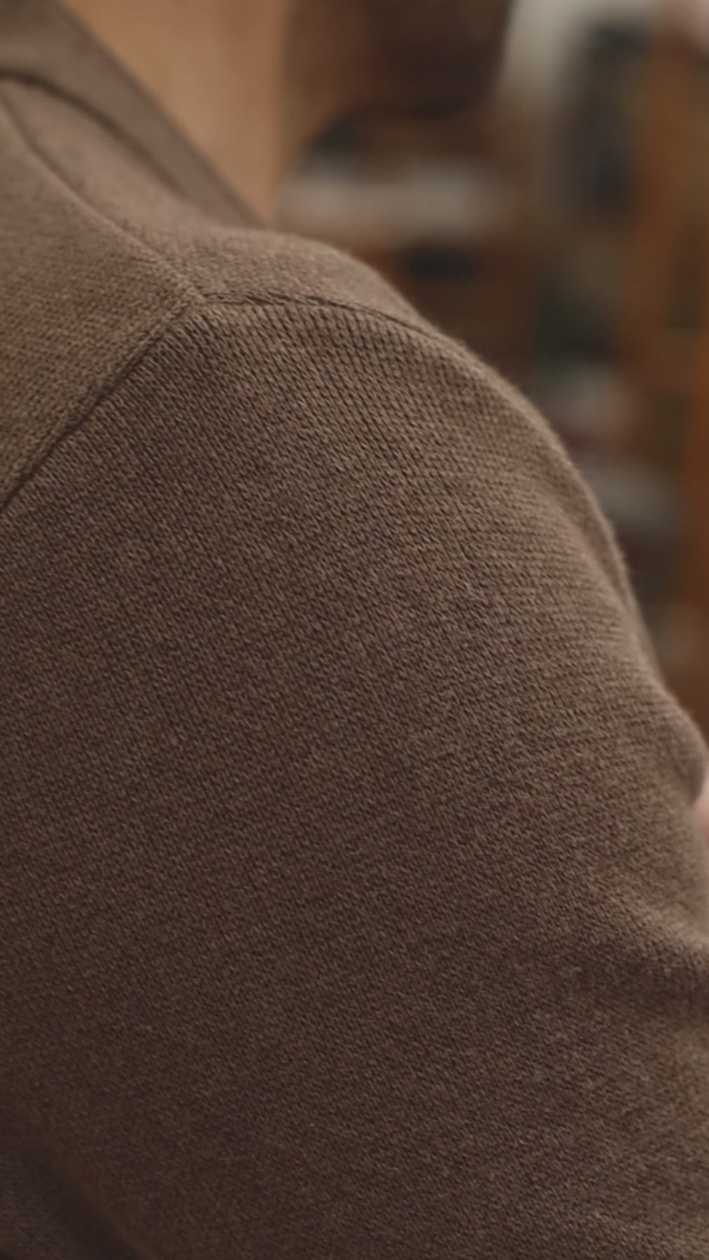 Close-up of a person wearing a brown mandarin collar jacket with a neutral background