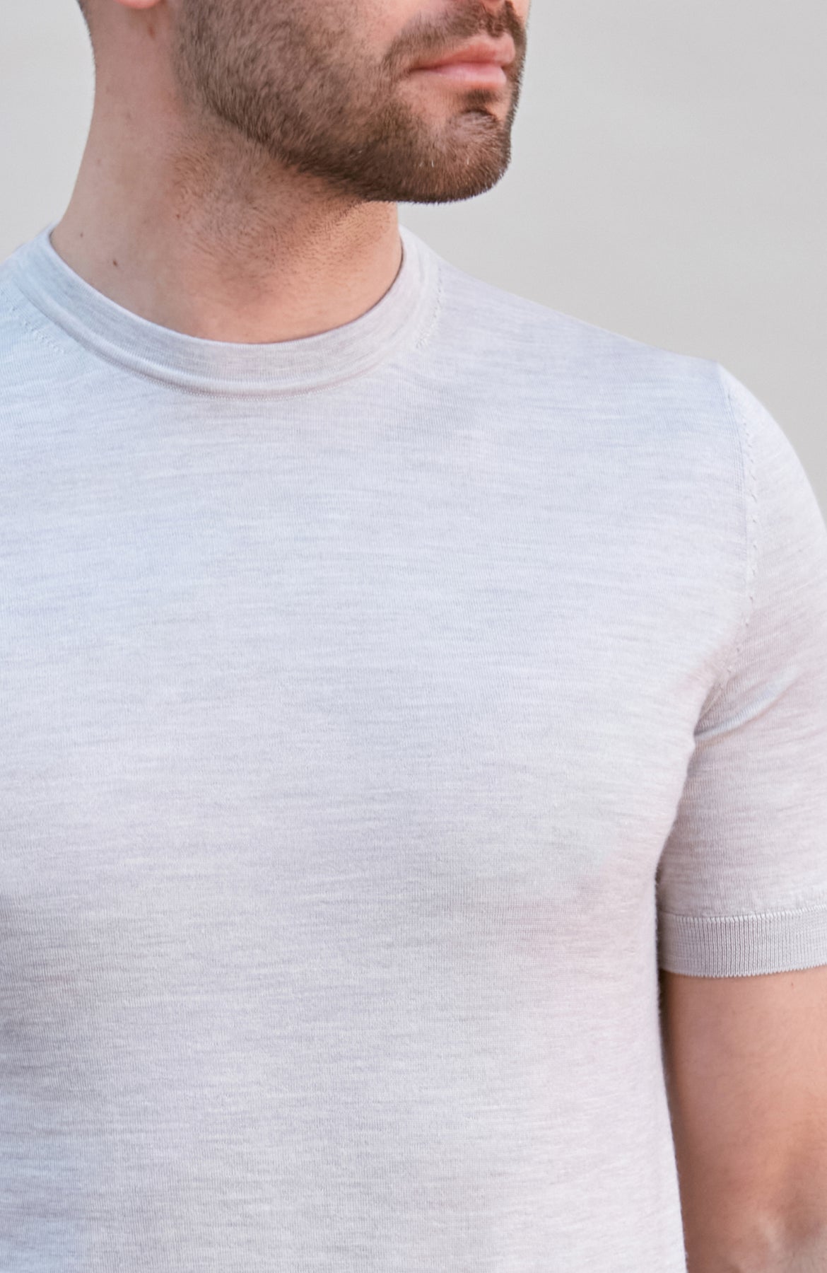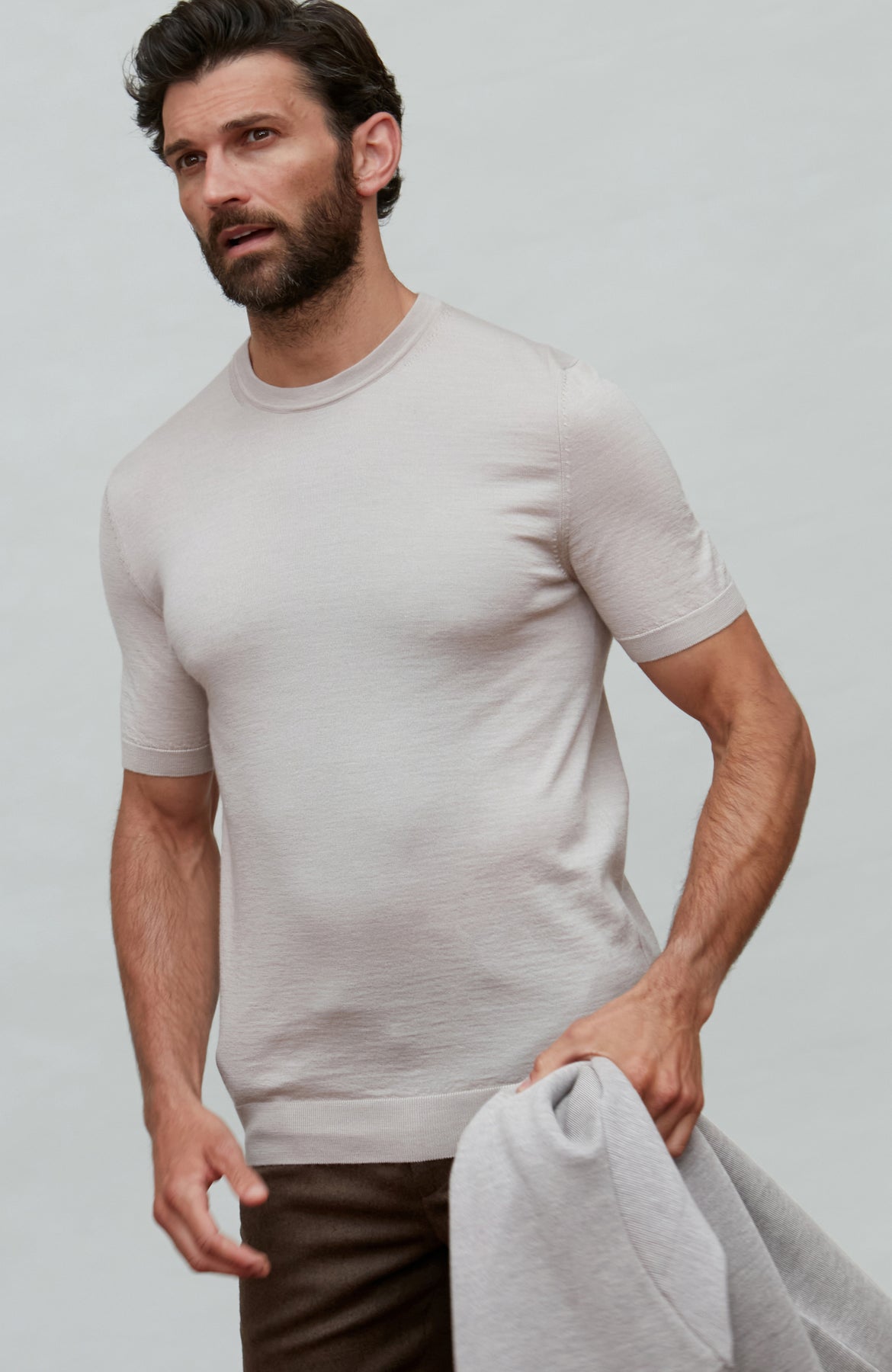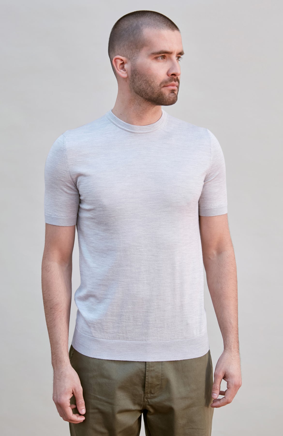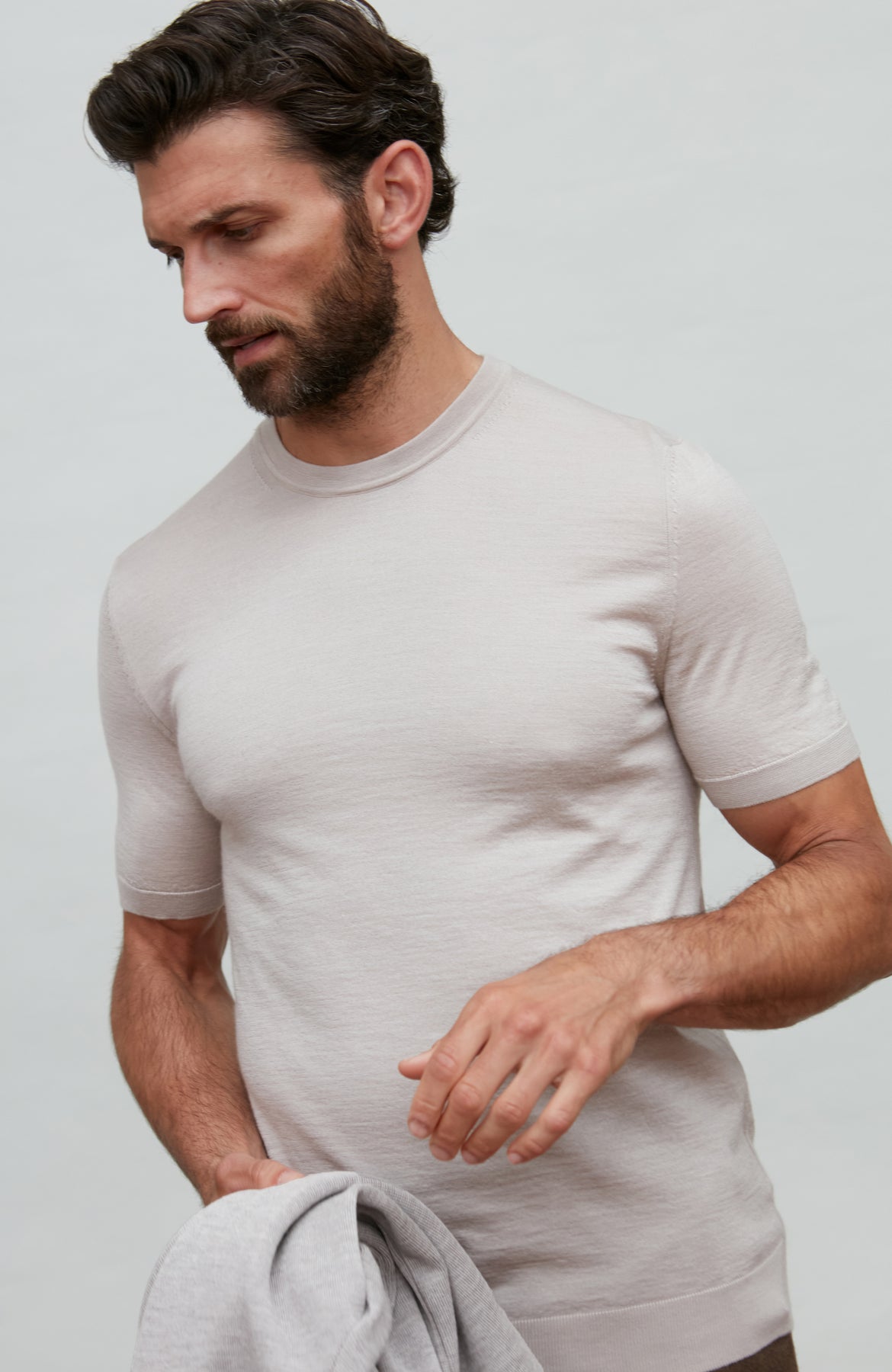 Bellini is a robust crew neck short-sleeve knitted jumper crafted from an Italian-spun blend of 70% superfine merino wool and 30% silk, designed for refined comfort across all seasons. Lightweight and breathable, it’s perfect for travel or long days and naturally resists odour, creasing, and moisture.
