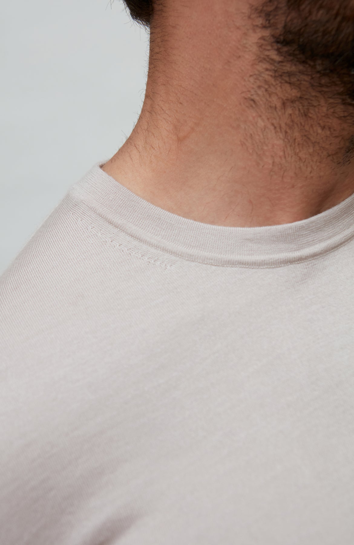 Weighing just 161g, this elevated piece blends the softness and thermoregulation of merino with the smooth drape and gentle sheen of silk. Bellini features a classic round neck with a fine jersey tubular detail for subtle structure, ribbed cuffs for a clean finish, and a deep hem trim that gives the t-shirt a modern silhouette and refined edge.
