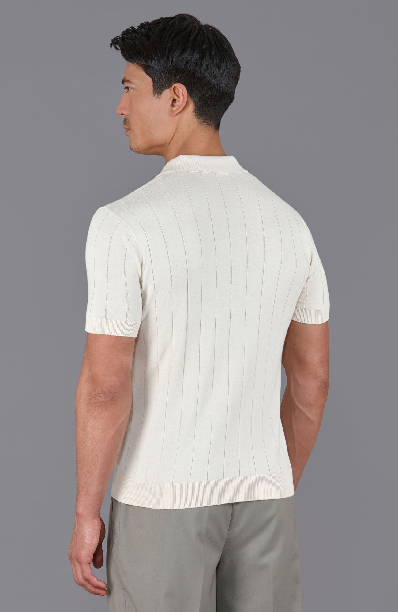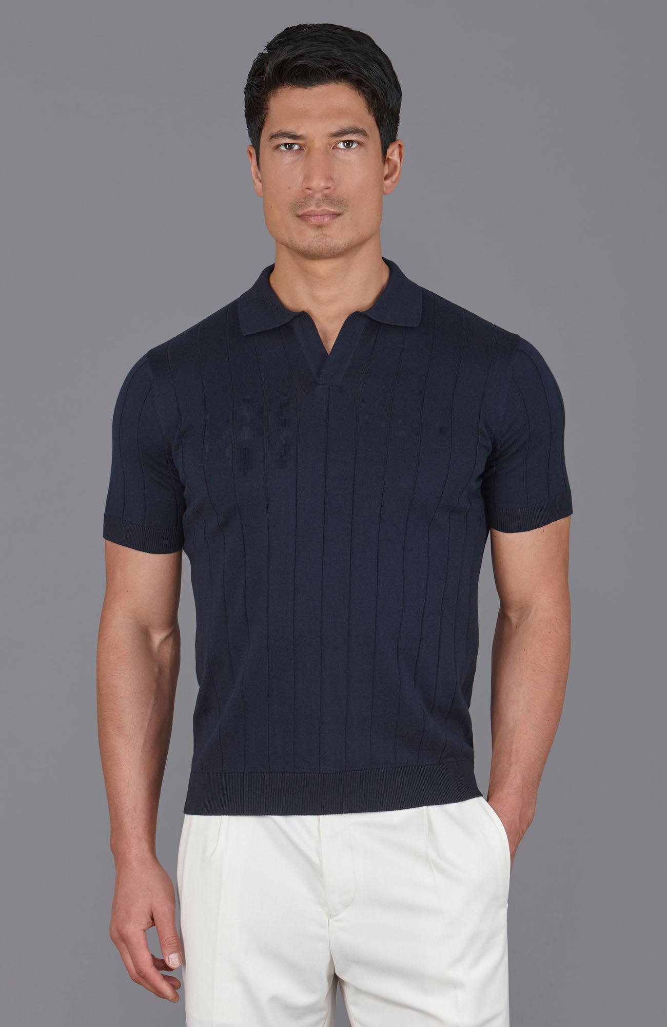 Designed with a clean, open collar and a subtle vertical stitch texture on the front panel, Riley offers a refined silhouette that feels soft against the skin. The ribbed hem and cuffs provide shape and structure, making it an ideal option when you want something smarter than a t-shirt, but just as easy to wear.