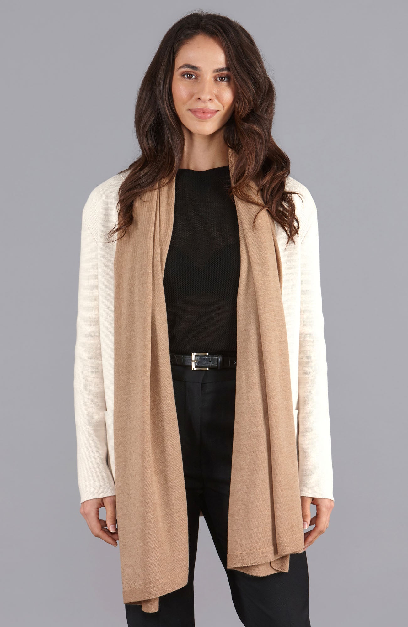 Woman sitting on a chair wrapped in a merino wool scarf with a neutral color palette
