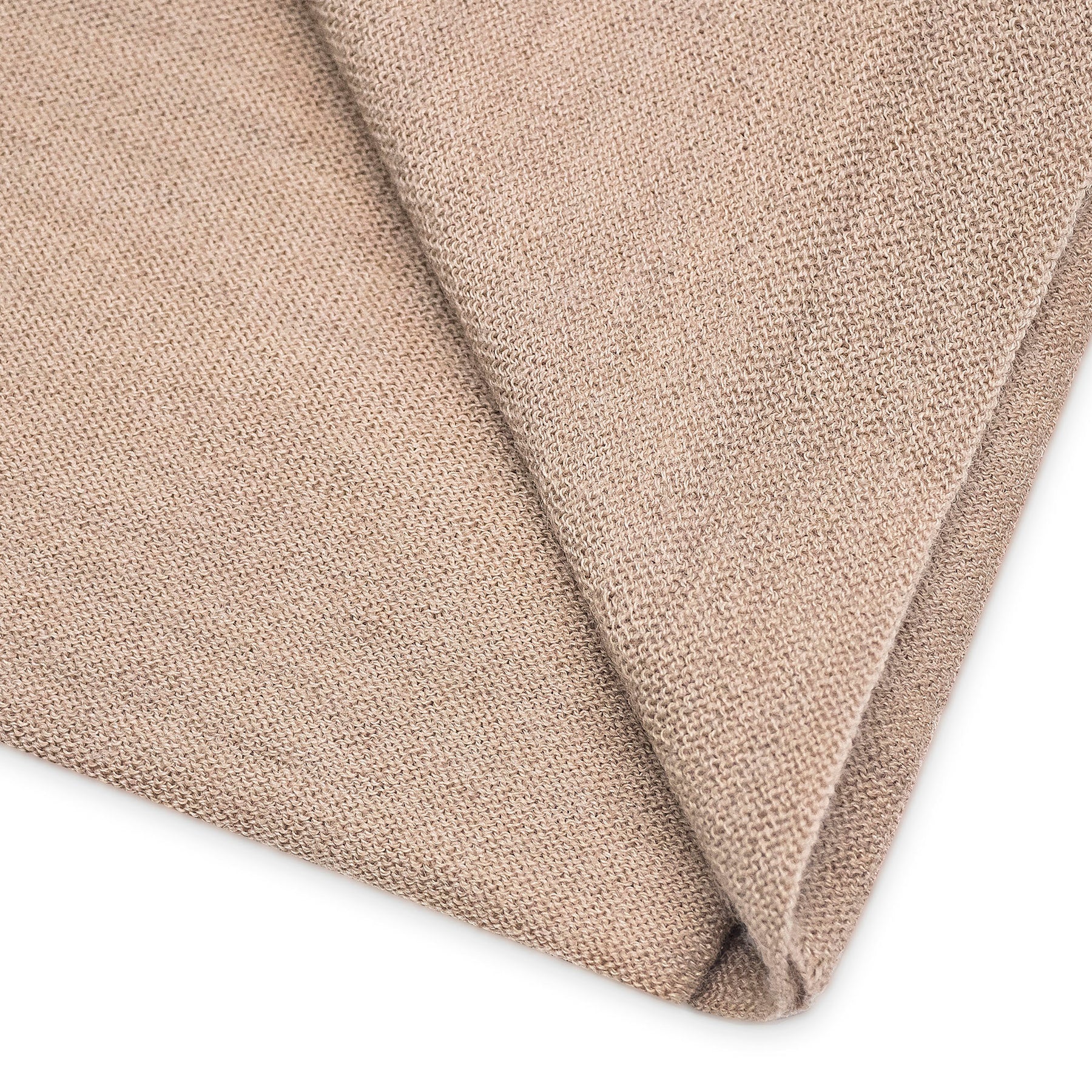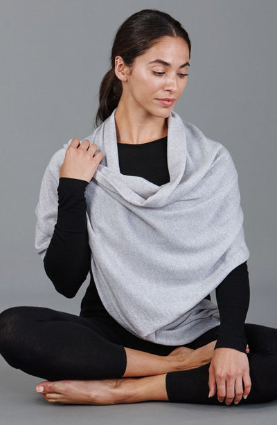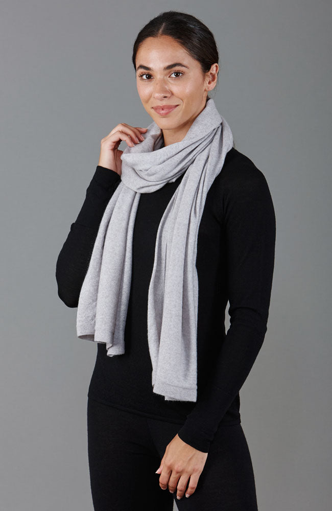 Woman wearing a beige merino wool scarf and gray sweater against a light background