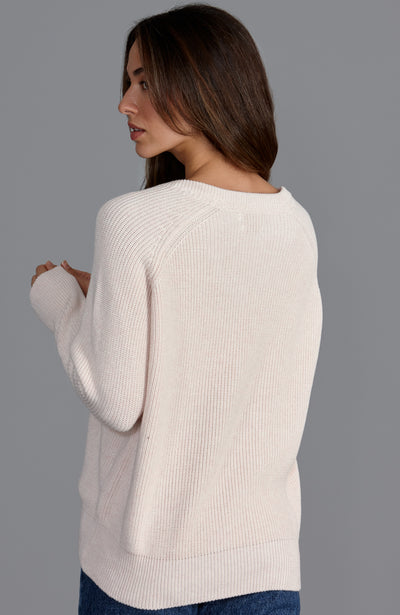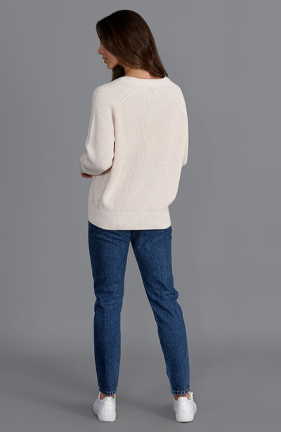 A modern twist to the classic fisherman knit jumper, this relaxed V neck sweater has been designed to be your cosy 'throw on' sweater. Made using super-soft cotton, the uniform all-over half cardigan stitch is knitted with a raglan sleeve to produce intricate details and a comfy slouchy look off the shoulders.