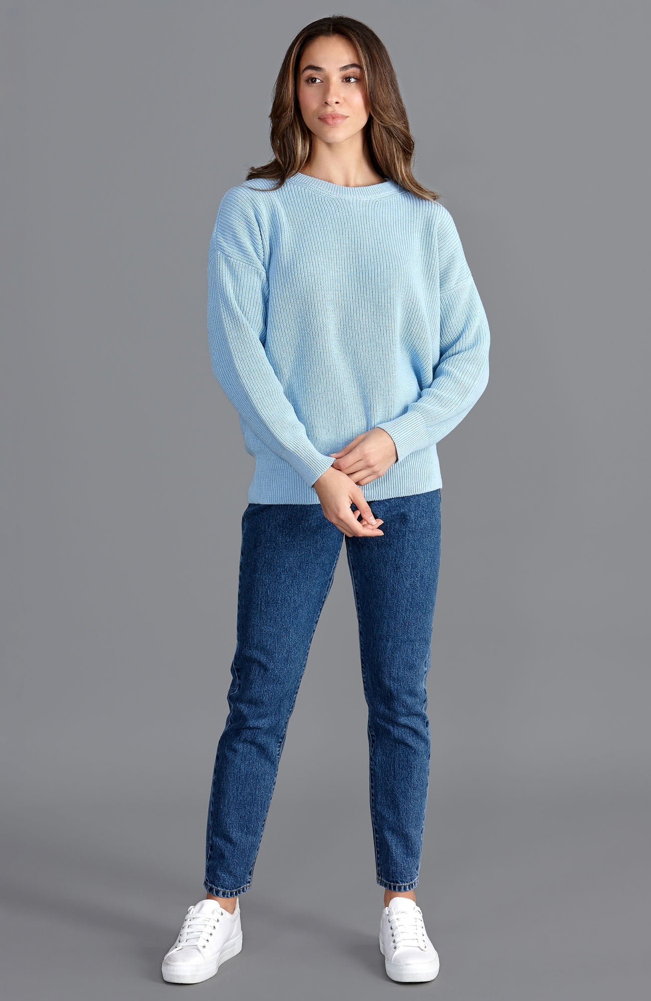 Woman wearing a light blue cotton fisherman rib sweater against a plain background
