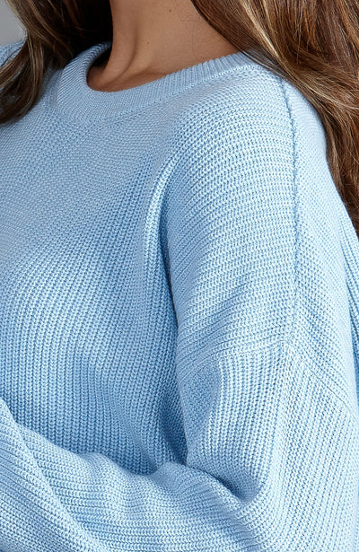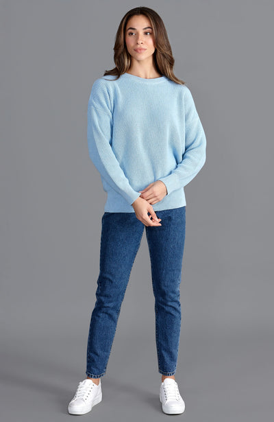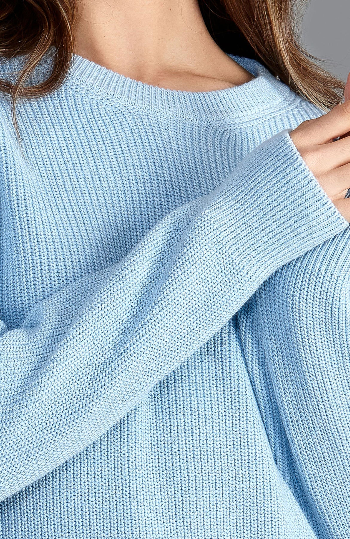 Light blue cotton fisherman rib knitted sweater worn by a person with a neutral background
