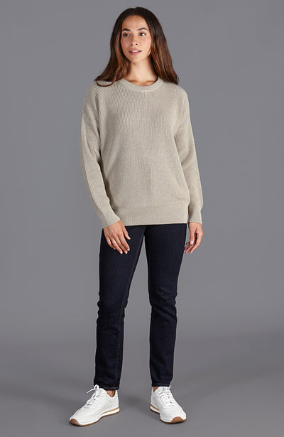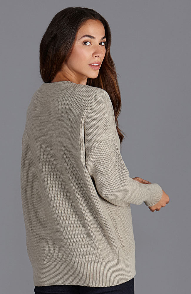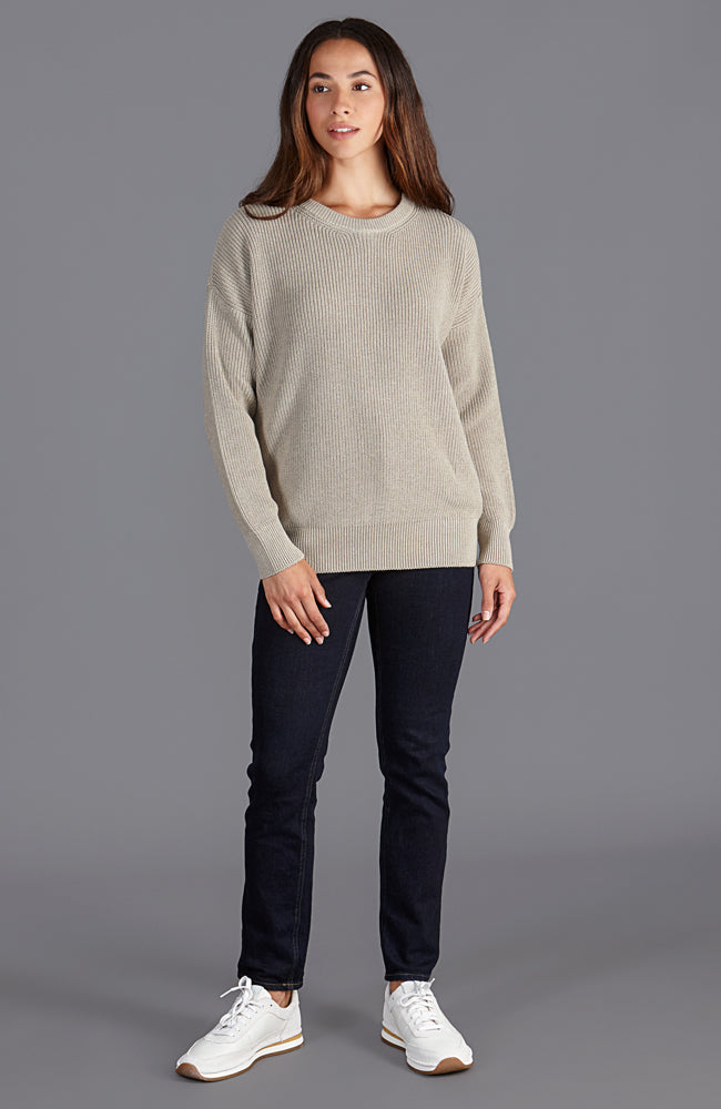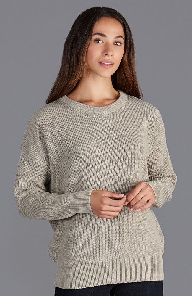 Woman wearing a beige cotton fisherman rib sweater against a plain background