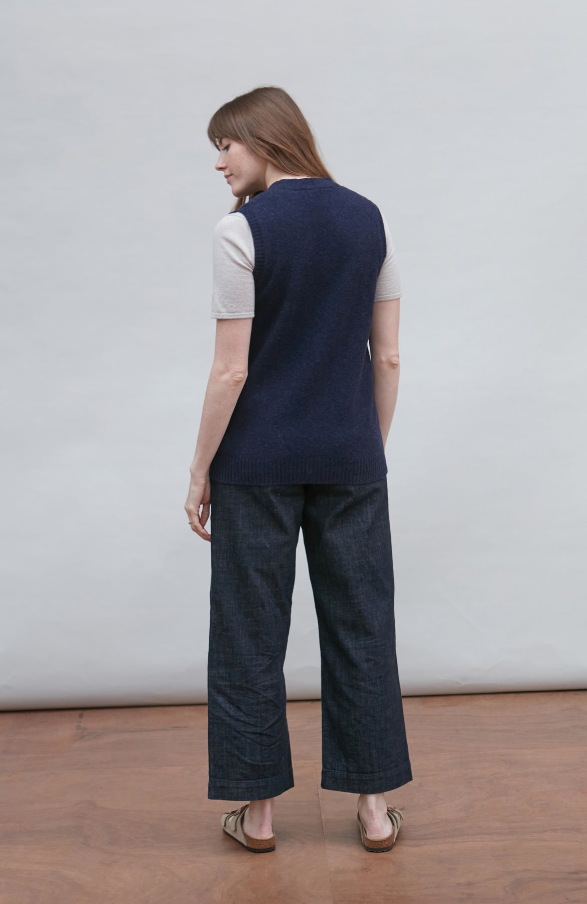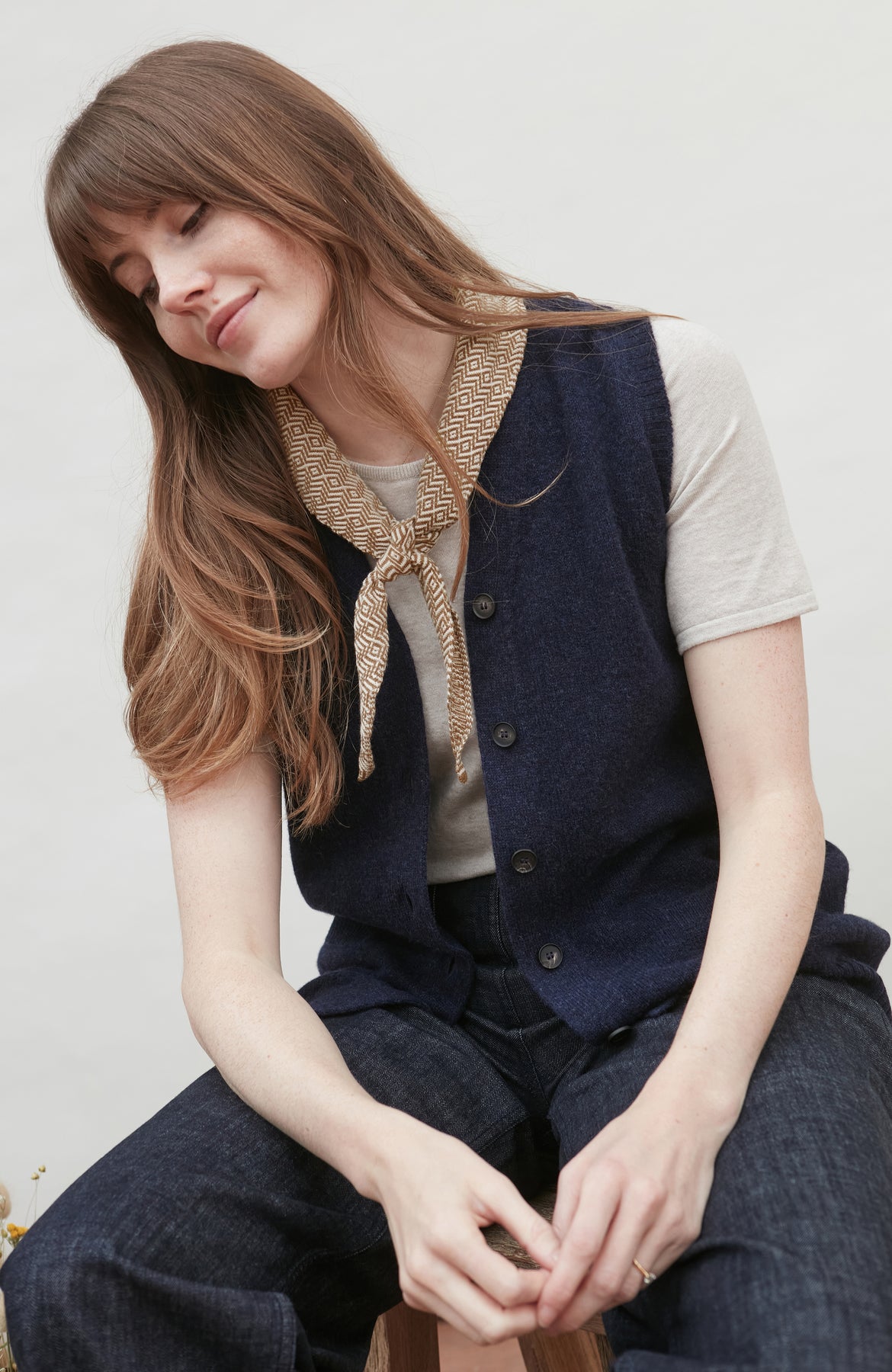 Made using Z. Hinchcliffe & Sons (Estd. 1766) British spun Lambswool, Laura is a relaxed fit 100% v neck waistcoat with pockets. Perfect for layering, this sleeveless cardigan is a cosy and warm midweight knit with a plain fabric structure. Pair with a long sleeve ultrafine cotton mock neck for a cosy laidback look.