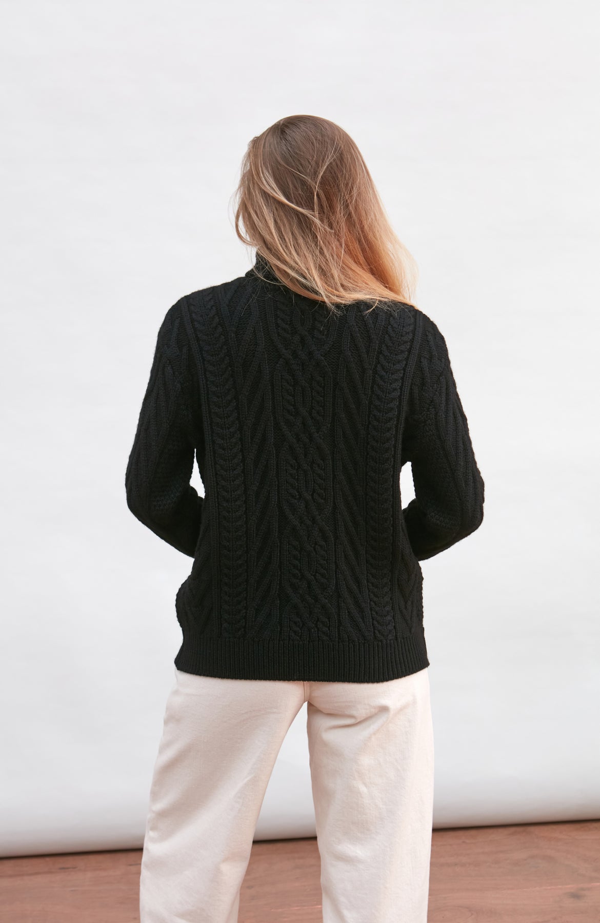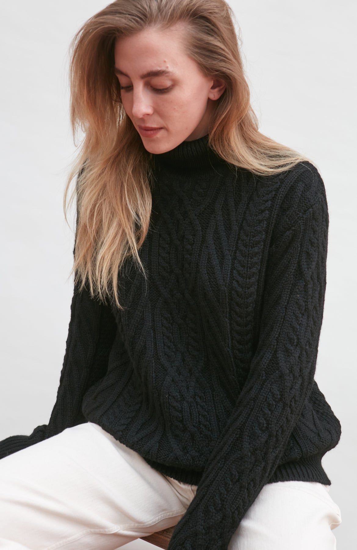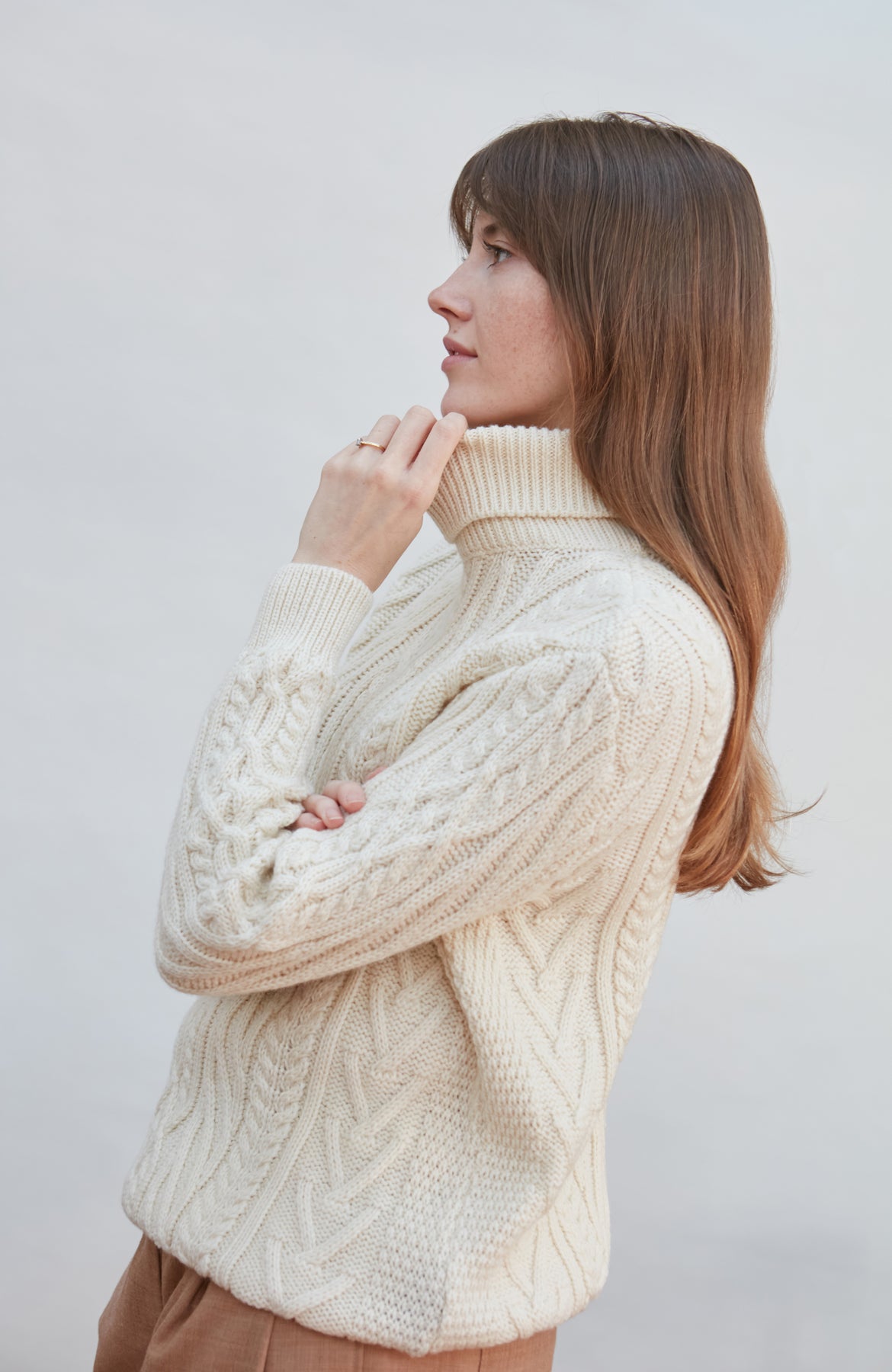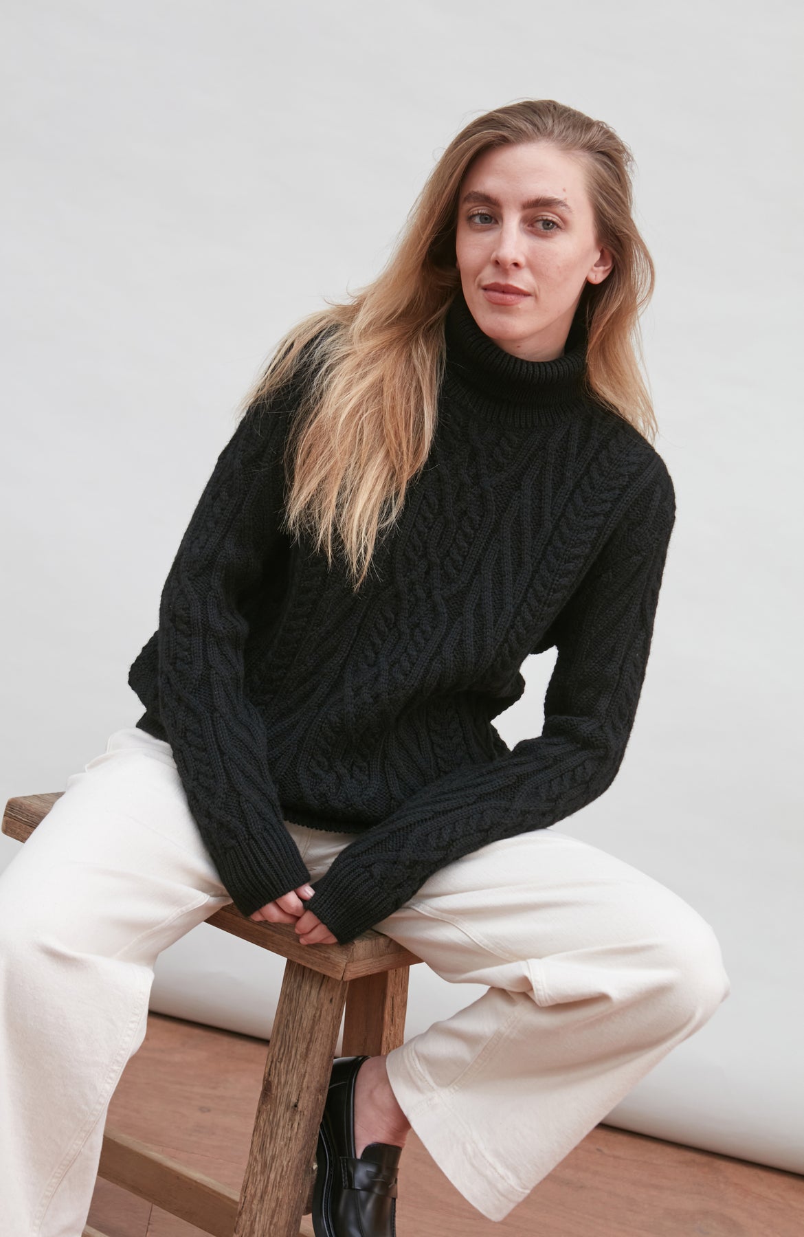 Made from heavyweight Andean pure merino wool, Maya is a beautiful chunky roll neck that combines a cosy all over cable and travelling Aran stitch details to create an eye-catching design.