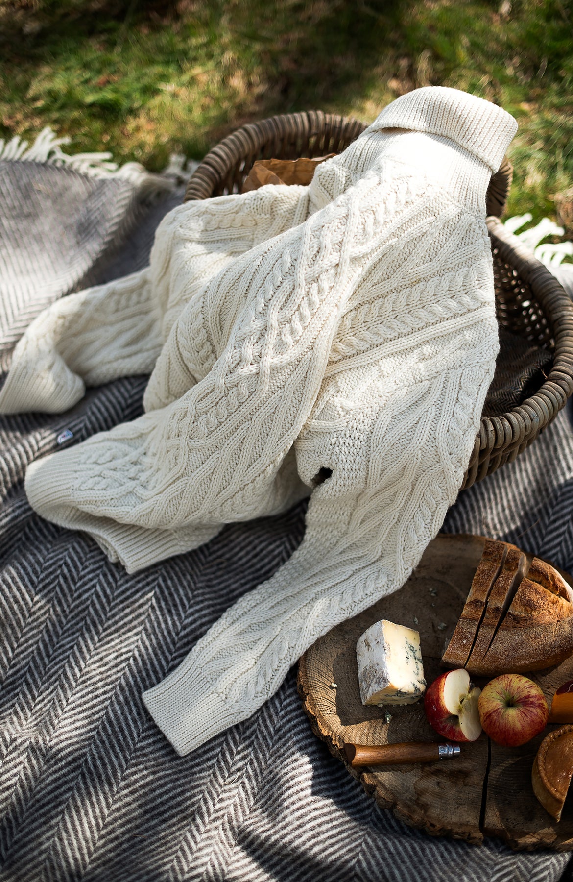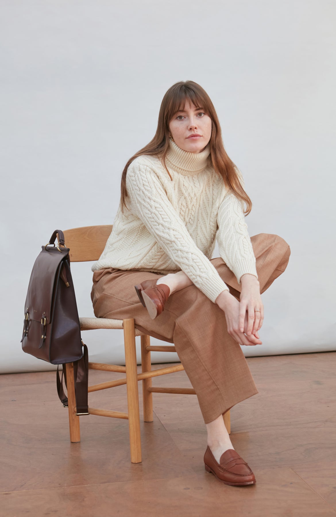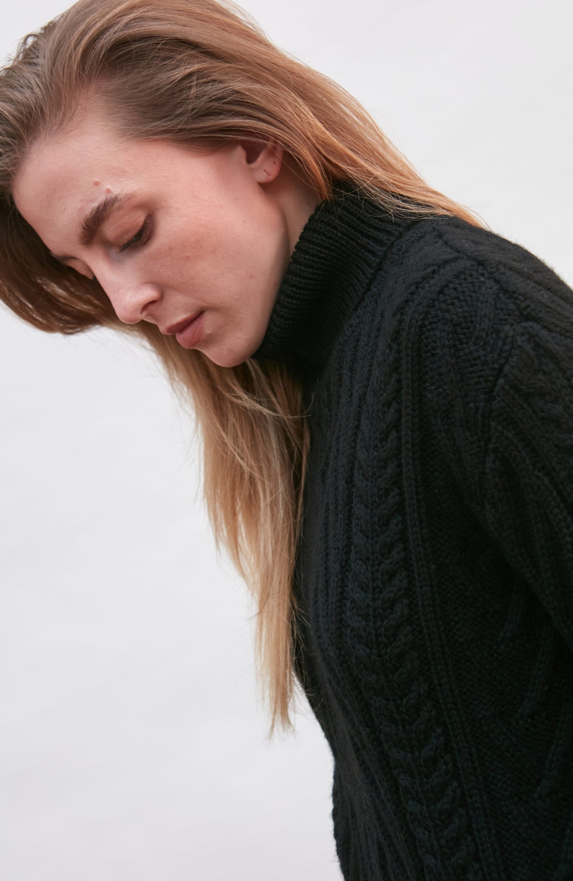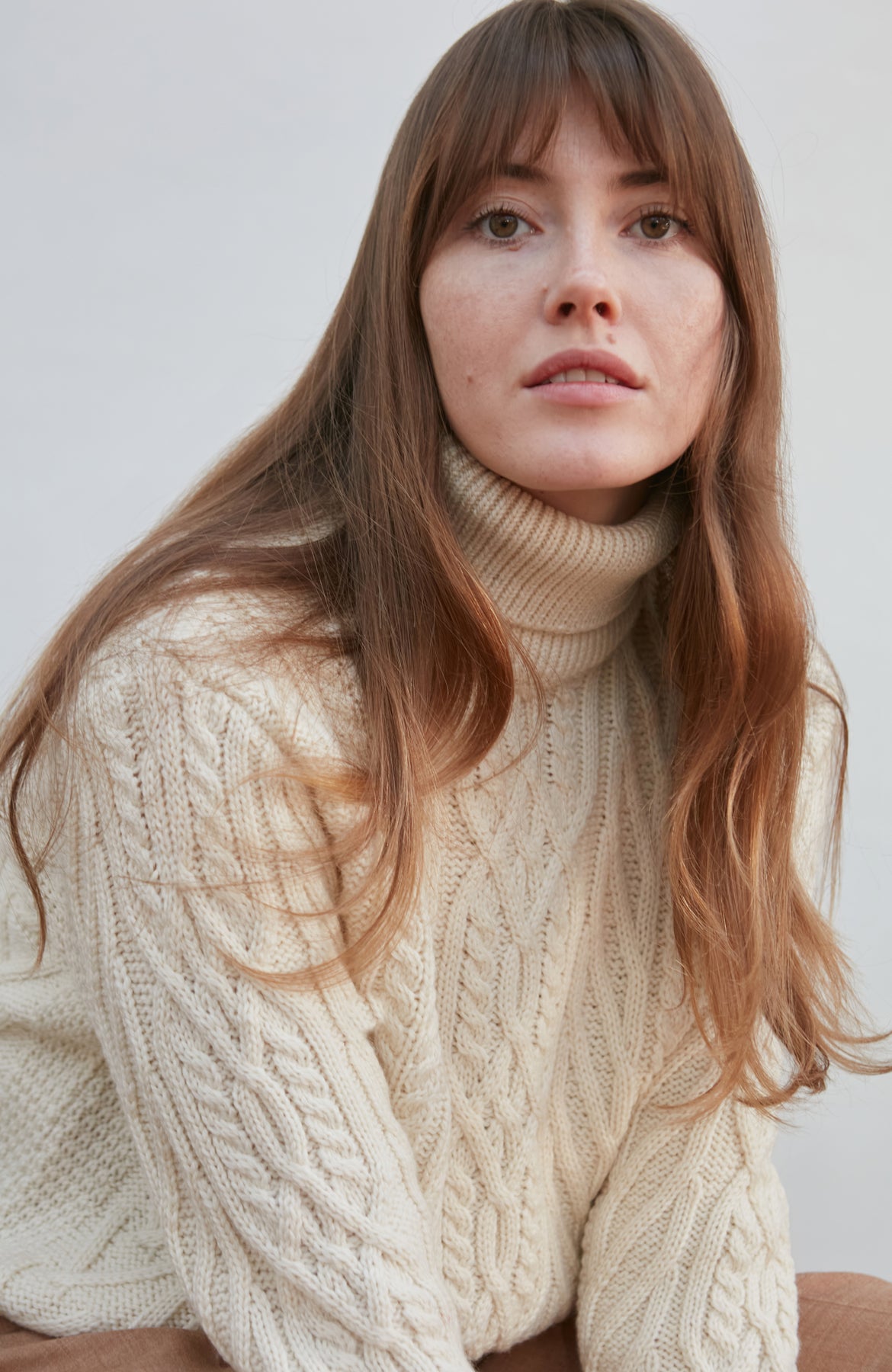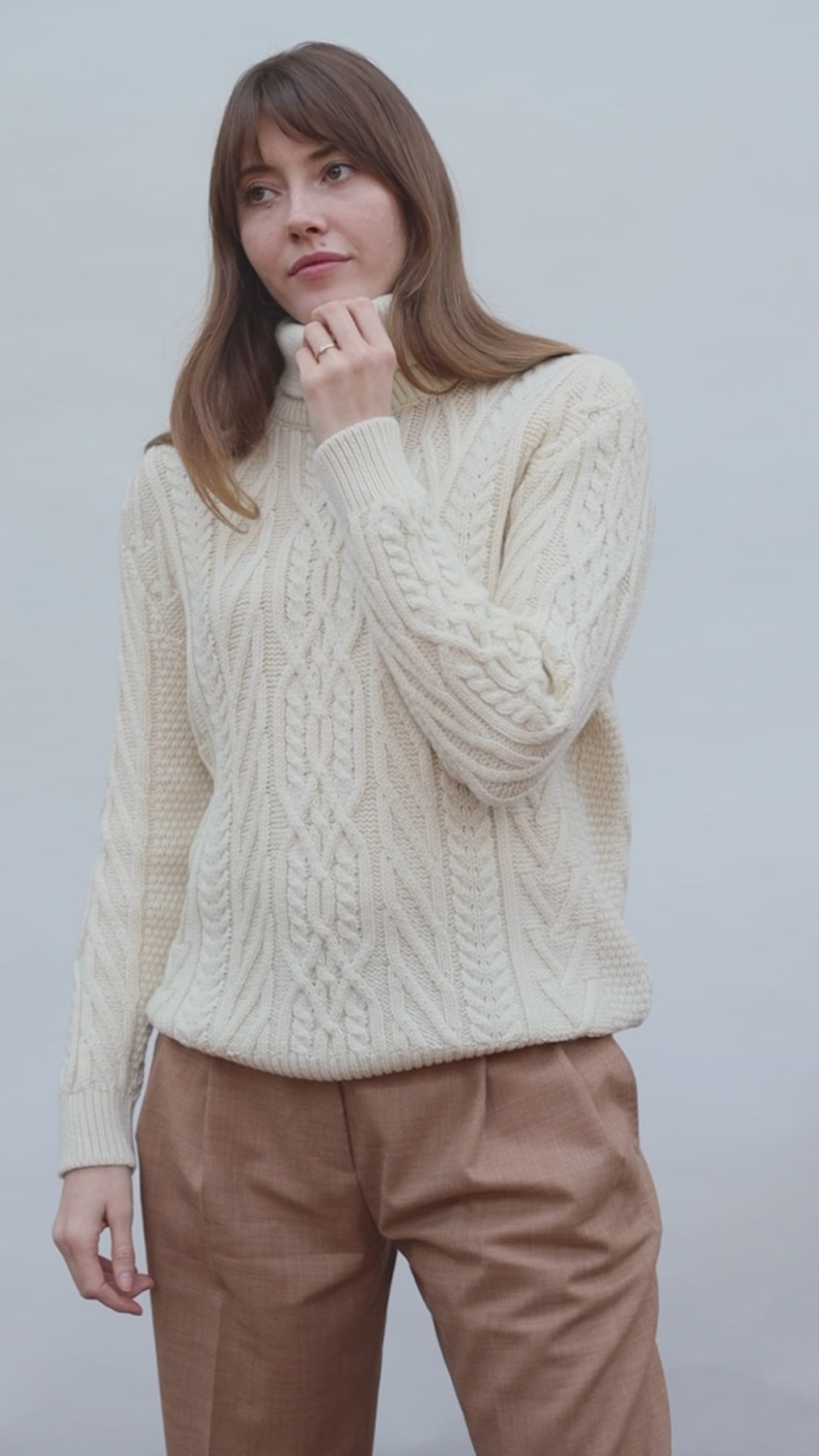 Made from heavyweight Andean pure merino wool, Maya is a beautiful chunky roll neck that combines a cosy all over cable and travelling Aran stitch details to create an eye-catching design.
