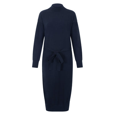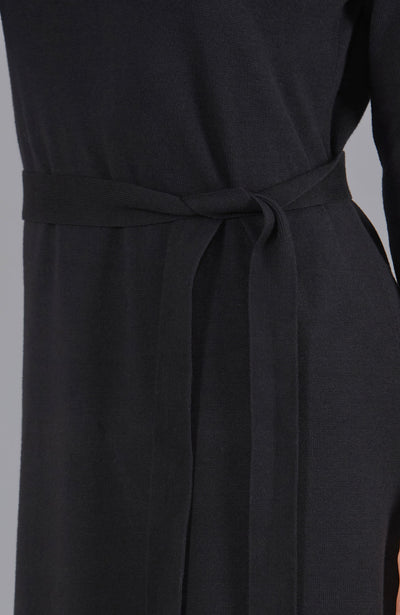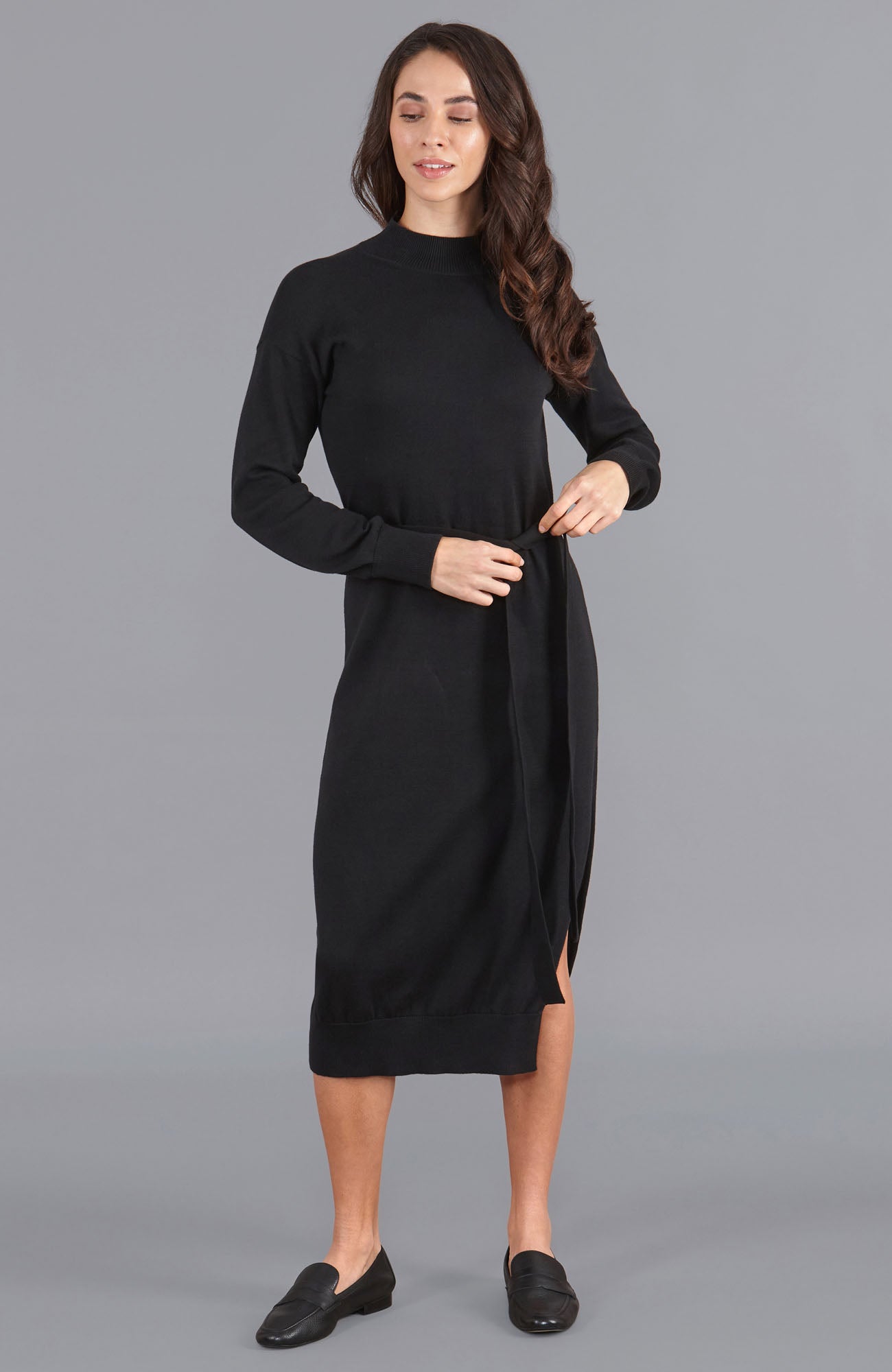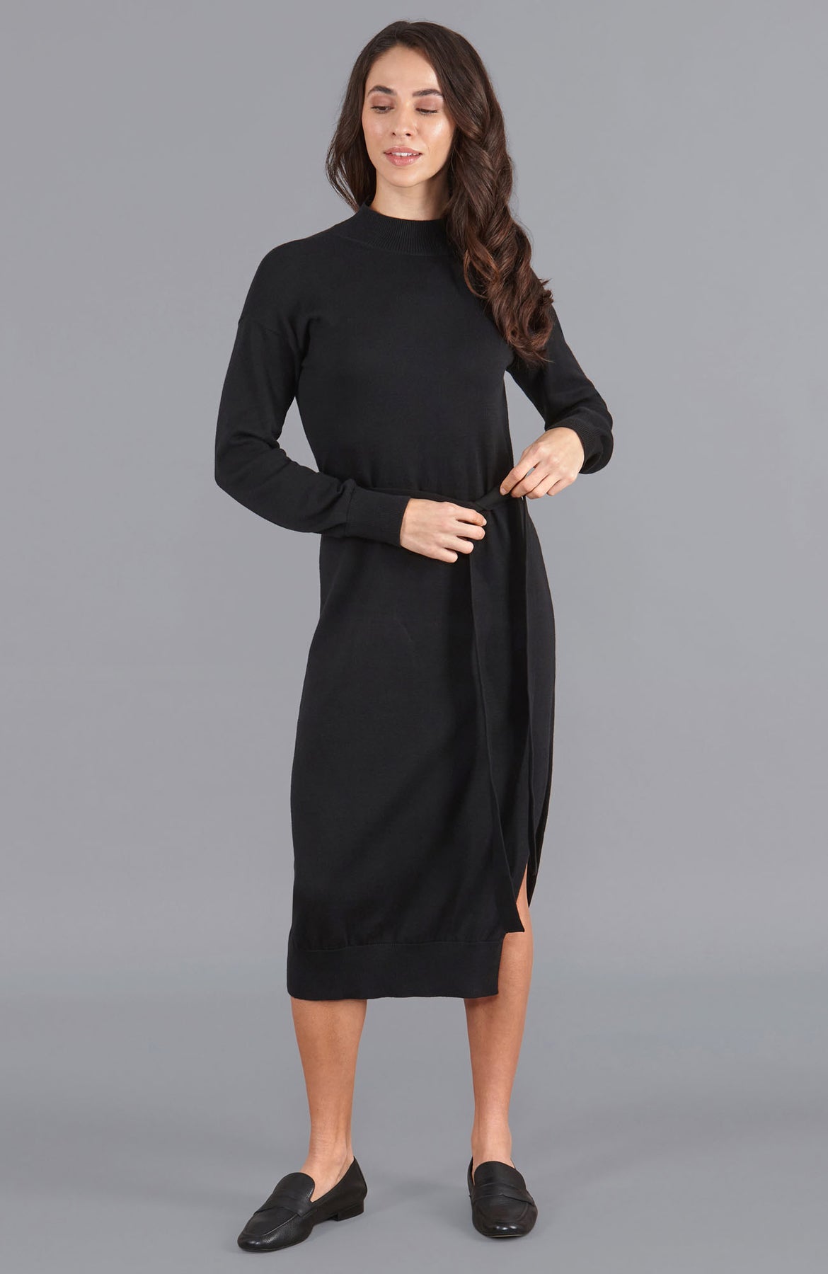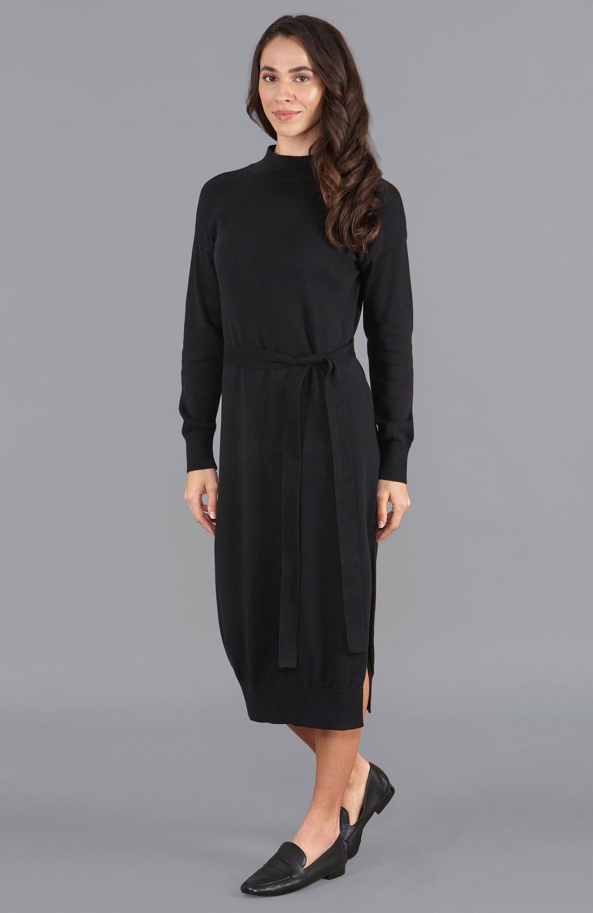 Cecelia is a midi-length knitted dress with a side slit and elegant mock neck made from lightweight cotton. The drop shoulder and deep cuff sleeves create a stylish and flattering relaxed fit, and we added an optional tie belt, allowing you to create a more cinched waist.