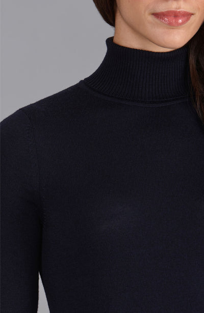 Harriet is knitted from soft Italian spun extra fine merino wool. Gentle, warm to touch and cosy to skin merino is a versatile layer which holds colour and shape. This crease resistant jumper is the ideal companion for long trips away or styling up or down for any impromptu event. It has a contemporary roll neck and an elegant ribbed cuff and hem.