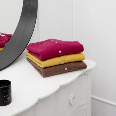 Leona is a classic crew neck long sleeve cardigan with delicate mother of pearl buttons, made from 100% British spun lambswool, sourced from Z. Hinchcliffe & Sons (Estd. 1766). The perfect wardrobe staple for layering, this midweight cardigan is suitable all year round. Pair with everything from your favourite jeans to summer dresses for an elegant timeless look.