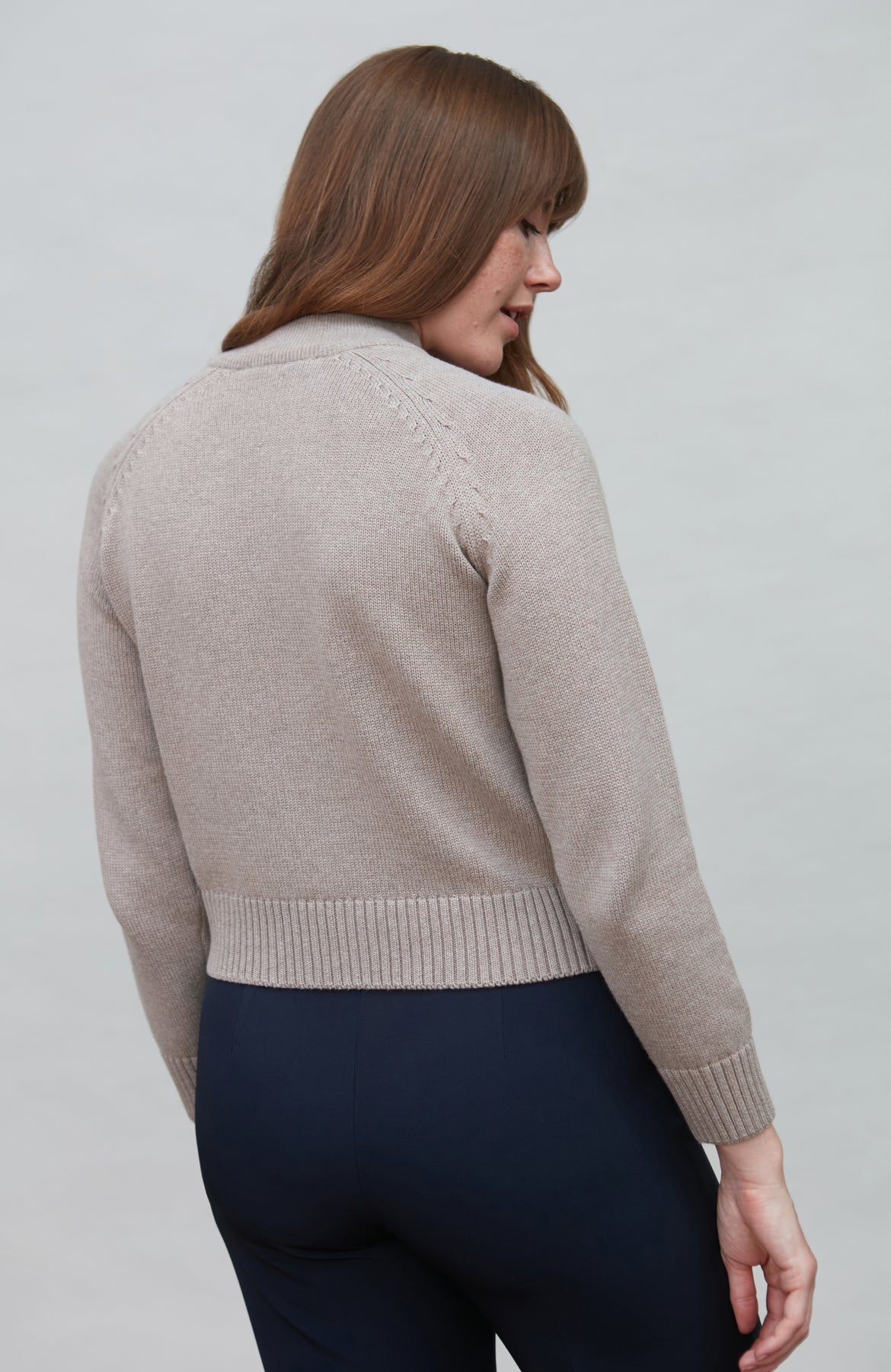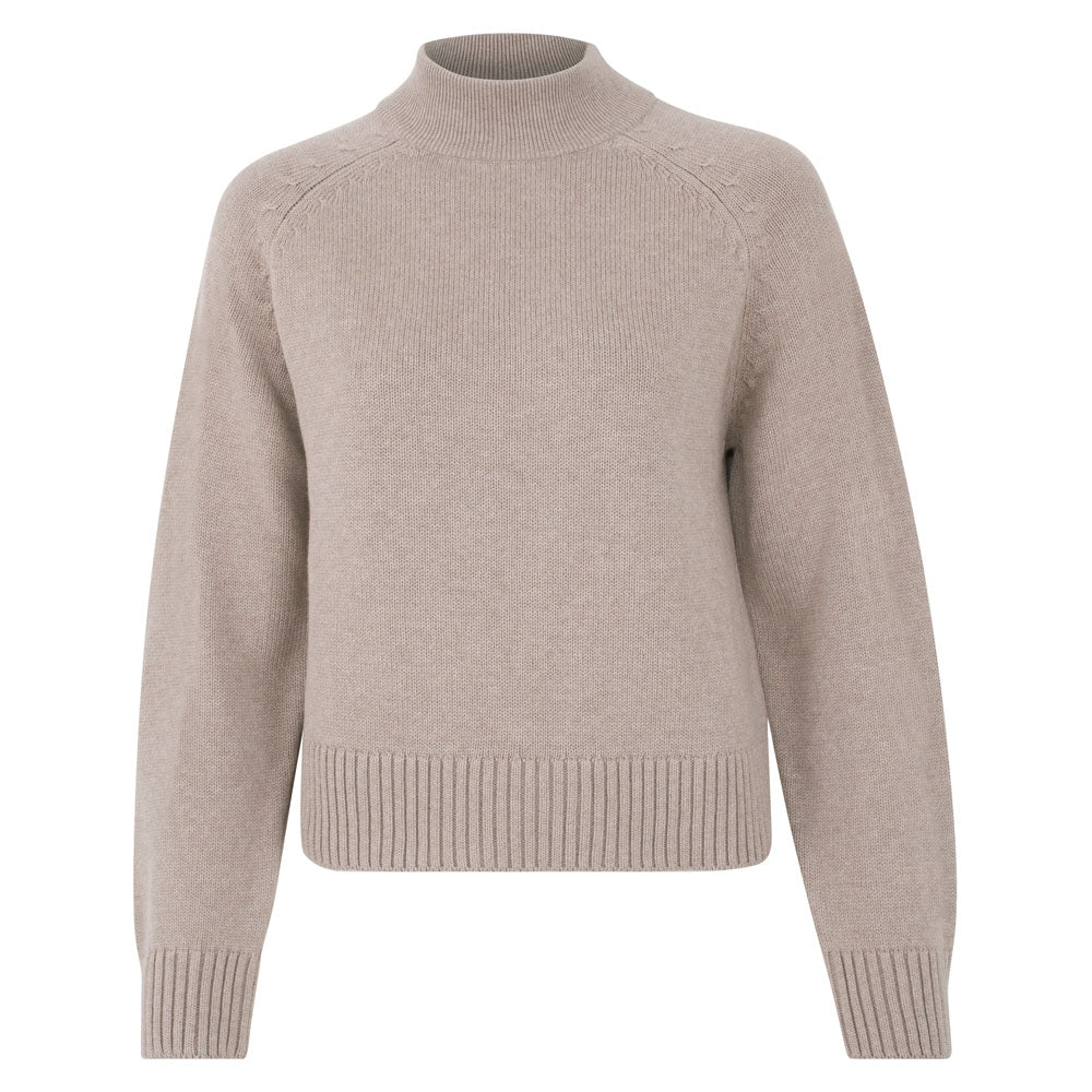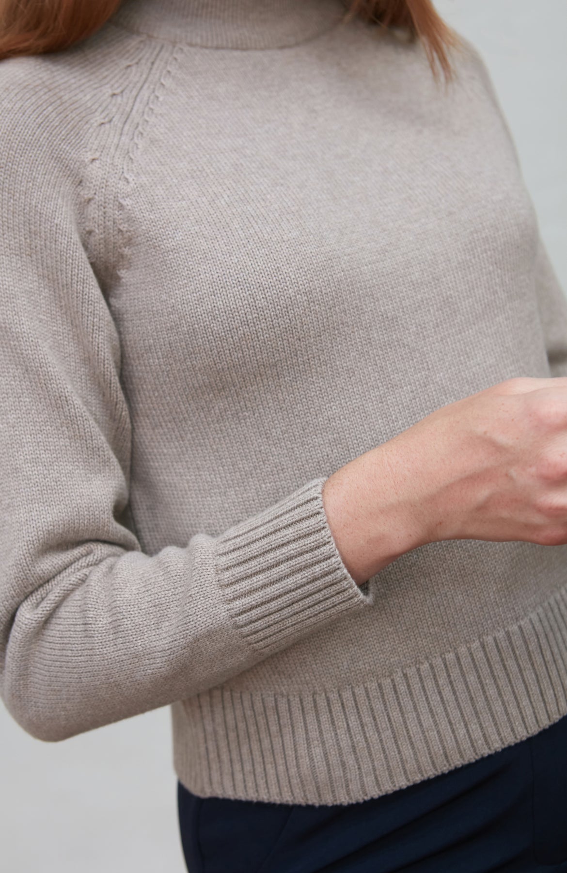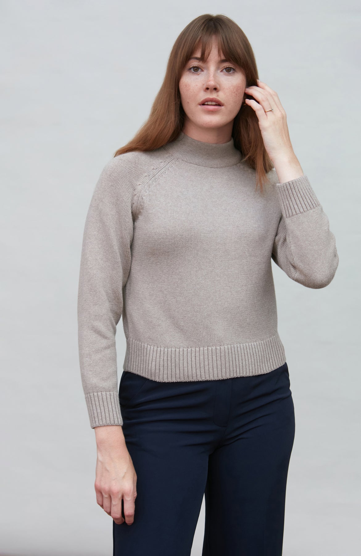 Woman wearing a beige cotton mock neck paul james knitted sweater and dark pants on a plain background