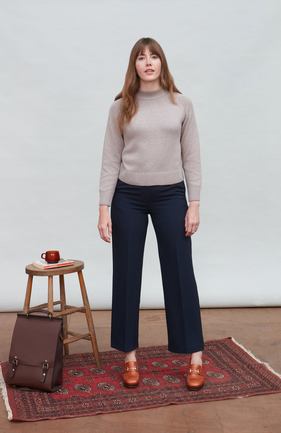 Woman wearing a beige cotton mock neck paul james sweater and navy pants against a plain background