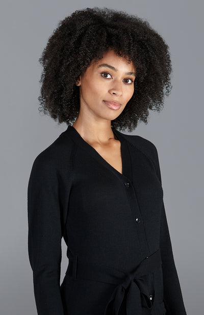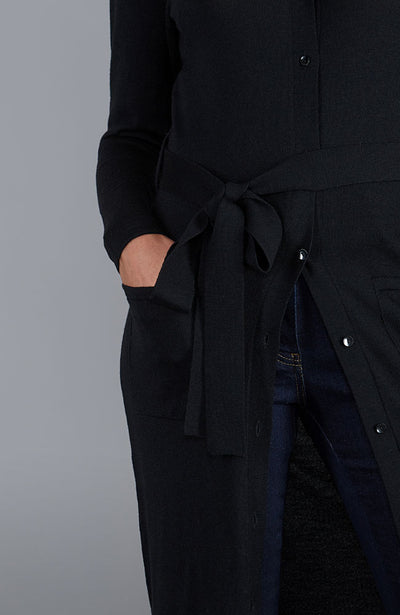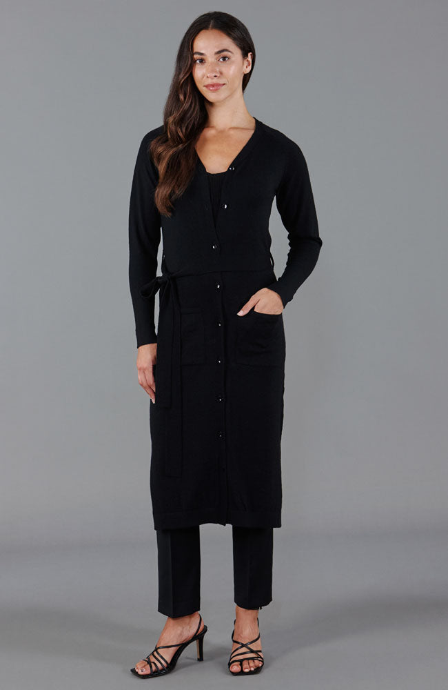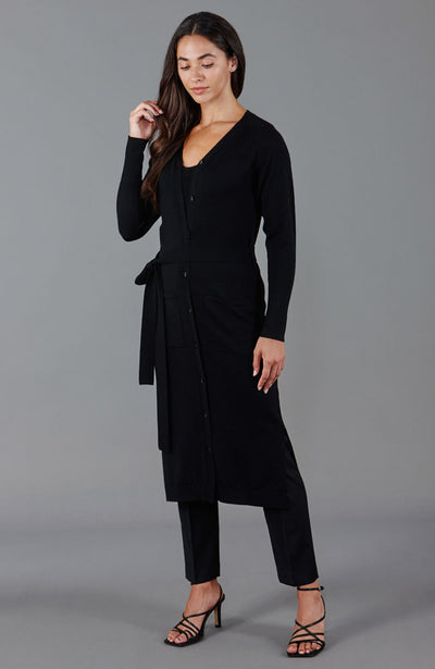 Luxuriously soft and comfortable, Holly is a fitted, long-length, v neck cardigan dress. Worn on its own as an elegant dress or layered over jeans or leggings for a stylish off-duty look, this lightweight knit is a versatile wardrobe piece. Made from the finest Italian merino wool sourced from Filivivi, Vicenza (Estd. 1817), this single jersey buttoned sweater has a tie allowing you to cinch the waist for a flattering look, and is perfect all year round.